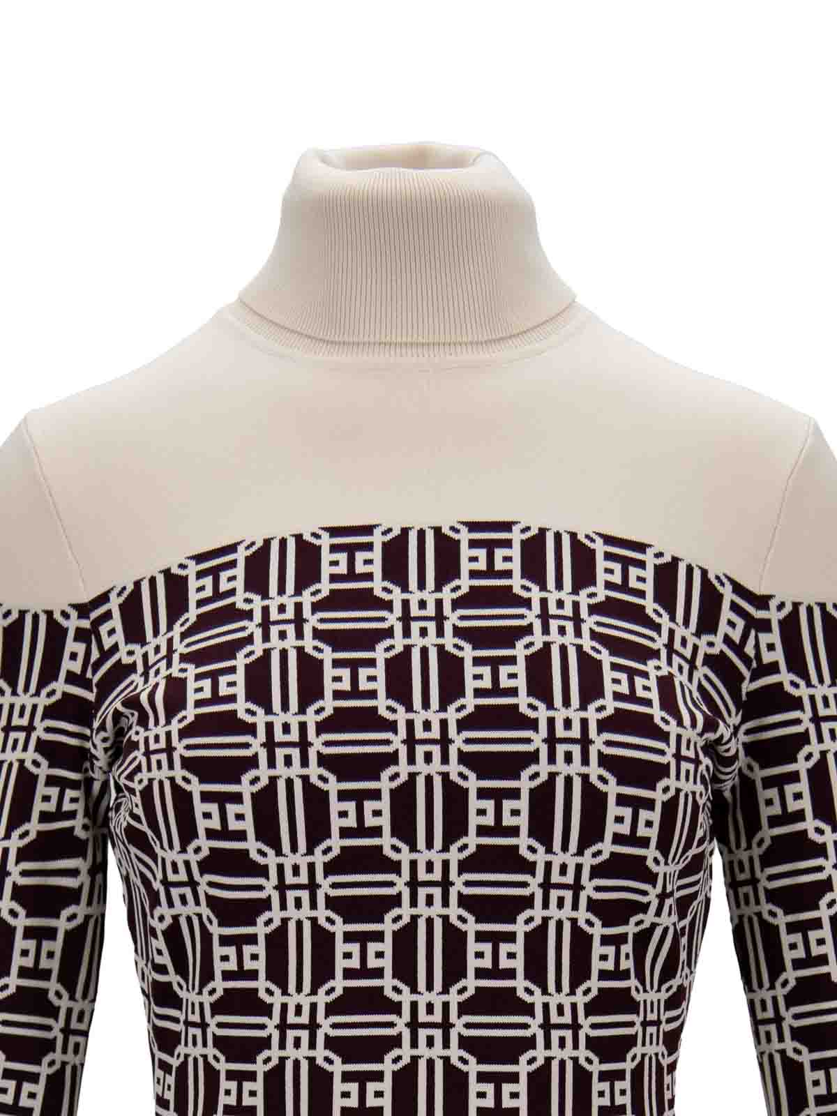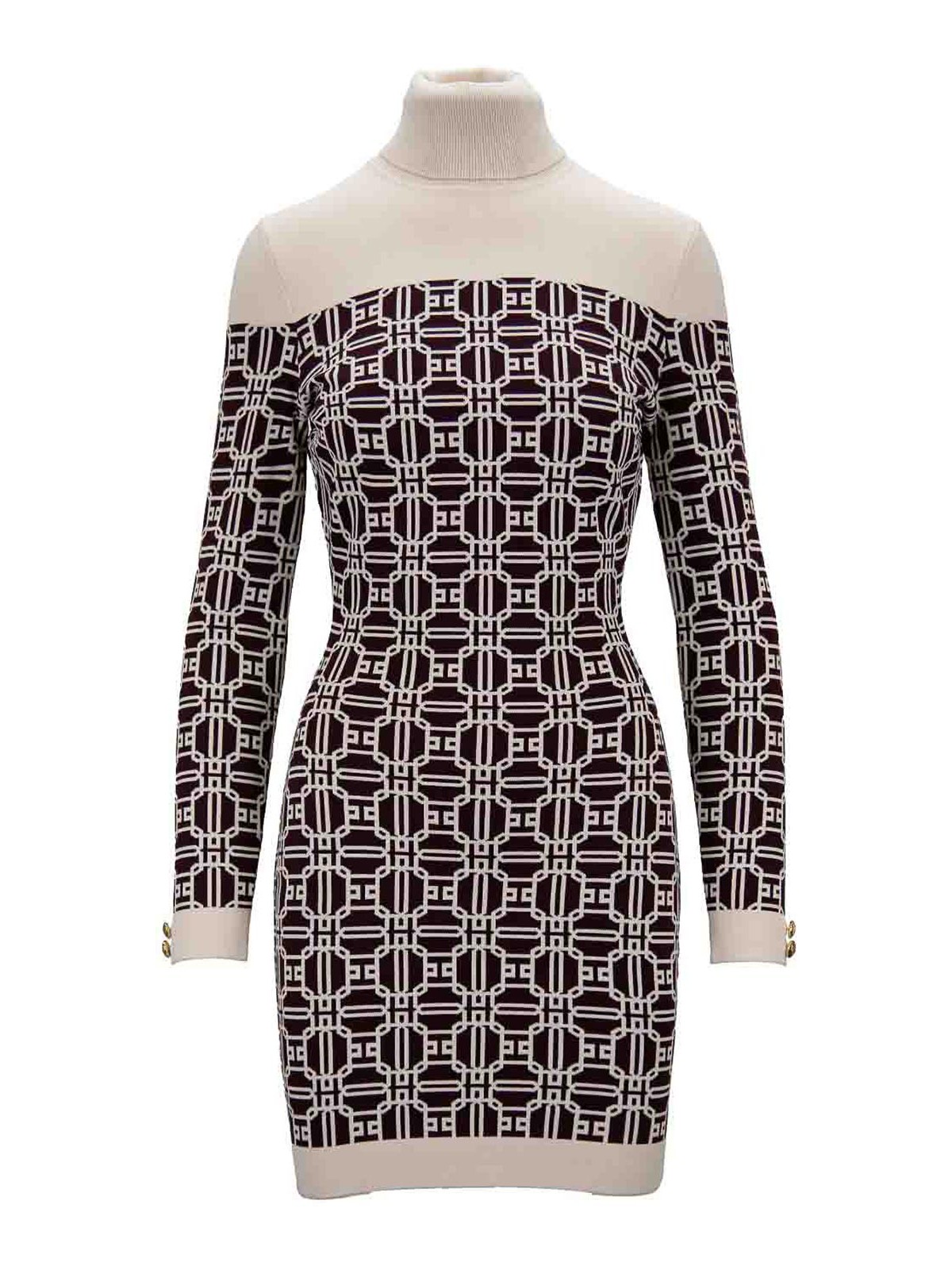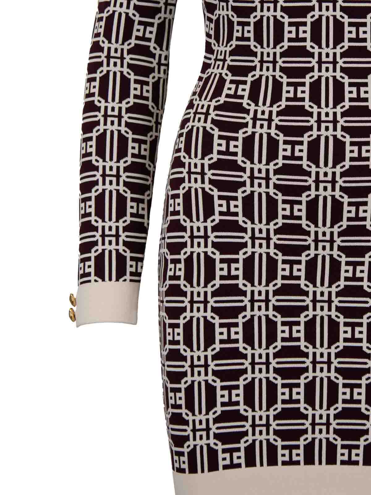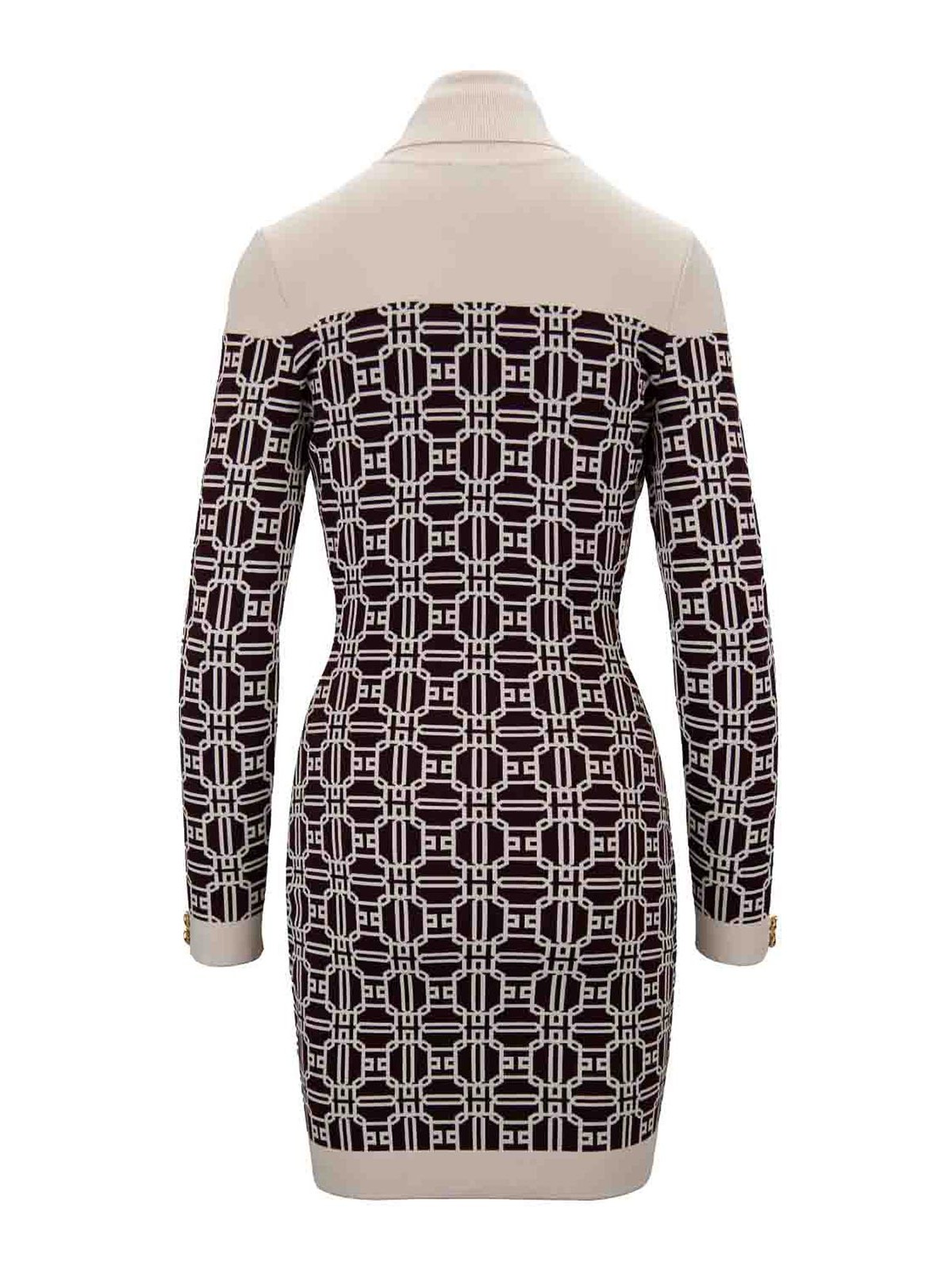 エリザベッタ・フランキの女性用ドレス。メインファブリックは 65% がビスコース、35% がポリアミド製です。ハイカラーとロングスリーブのショートニットドレス。後者は中央に高さと高さのボタンが付いています。外面はブランドロゴのモチーフが特徴で、コントラストカラーで作られています。隠しファスナーで横に閉じます。