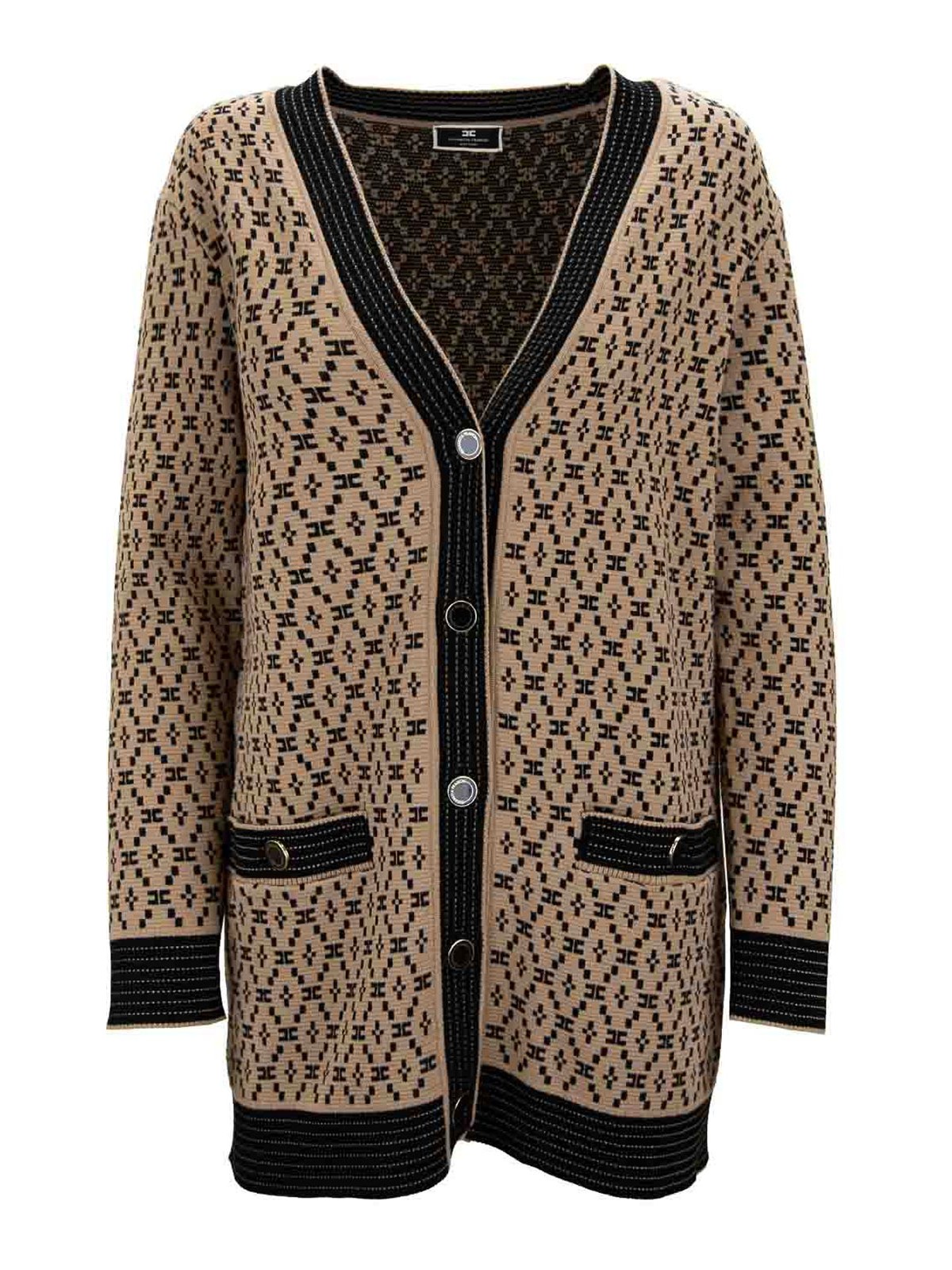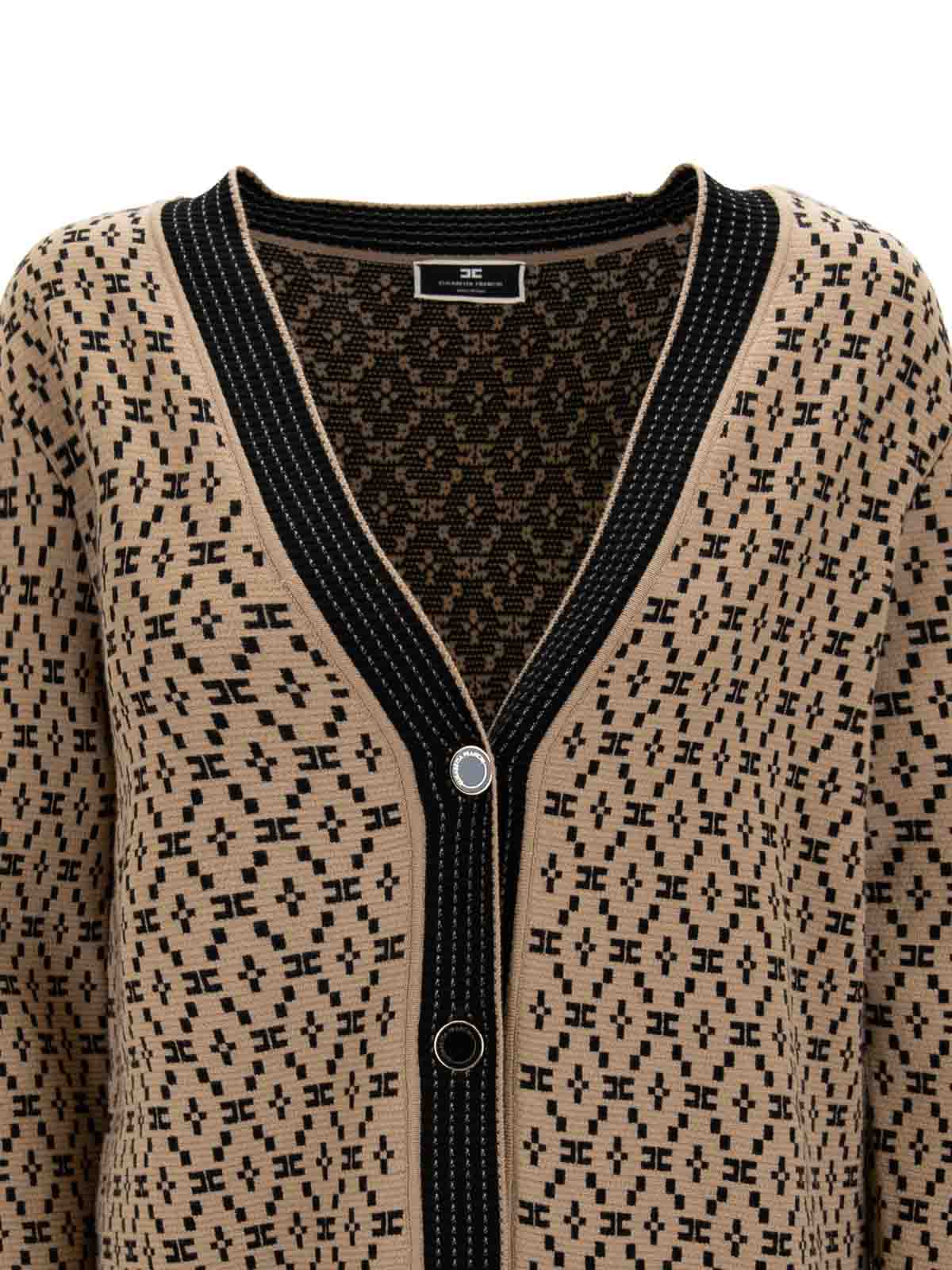エリザベッタフランキ女性用カーディガン。生地は 72% がビスコース、28% がポリエステル製です。長袖の前にネックラインをあしらったカーディガン。前面にはエンベロープポケットが付いており、ロゴボタンで留められます。外側の表面は、コントラストカラーのブランドロゴモチーフが特徴です。ゴールドメタル製のロゴ入りボタンで留めます。イタリア製。