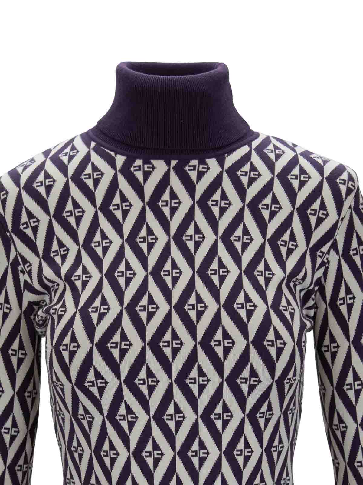 Elisabetta Franchiの女性用ドレス。ビスコース80%、ポリアミド20%を実現した生地。長袖ロング丈のネックレザードレス。アンチェッドショルダー。全面にファンタジアのロゴマークをあしらったモチーフ。