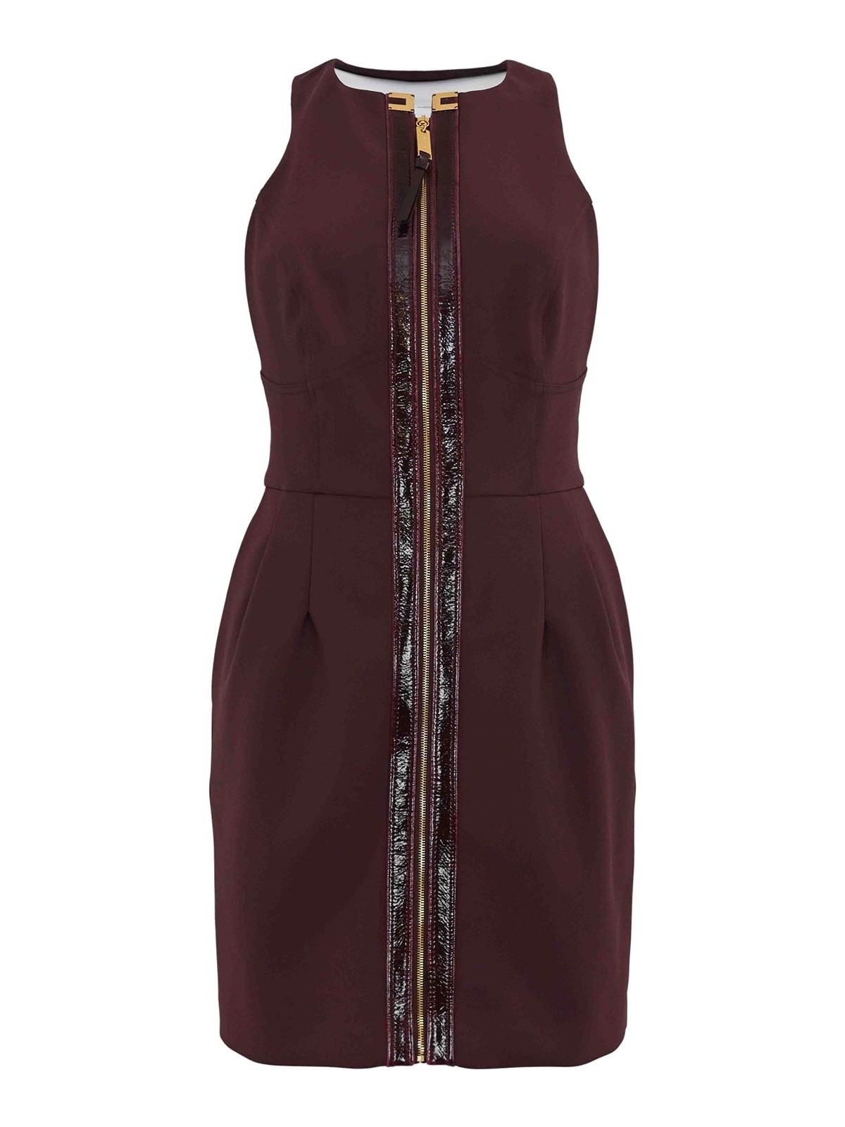 ストレッチダブルクレープクローケルノースリーブホルターネックジッパーカットアウトとダーツアンフォラシェイプロゴスリムフィット