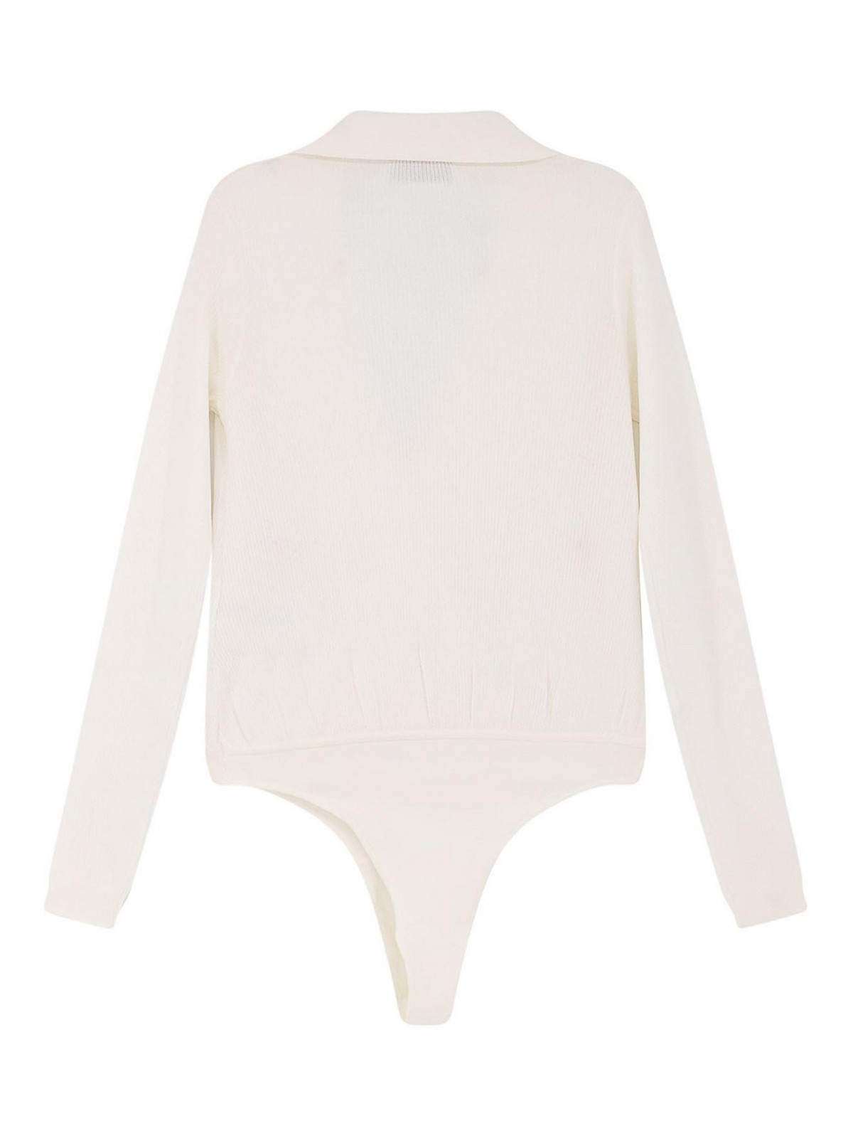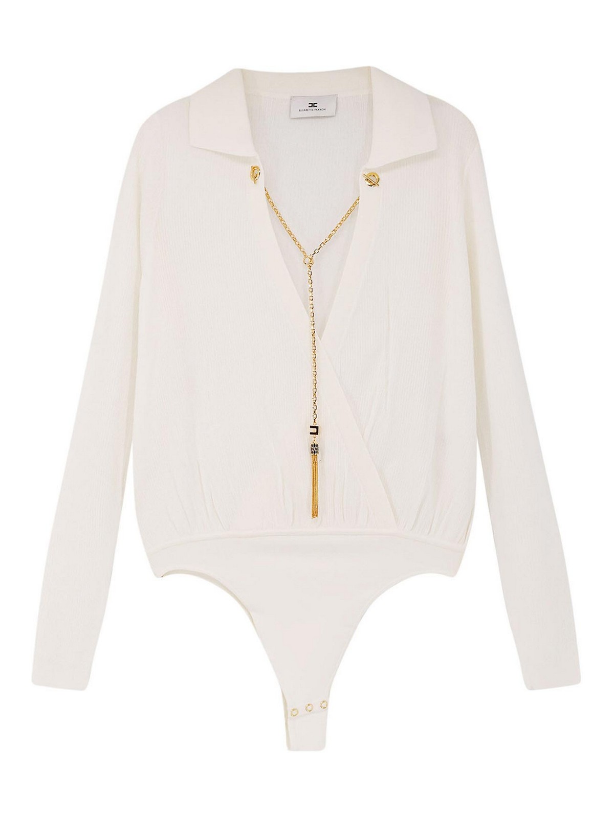 下部にフック留め、深いVネックラインとクラシックな襟、ロゴ入りメタルチェーンのディテール、ロングスリーブ 75% ビスコース 15% ポリアミド 10% シルク