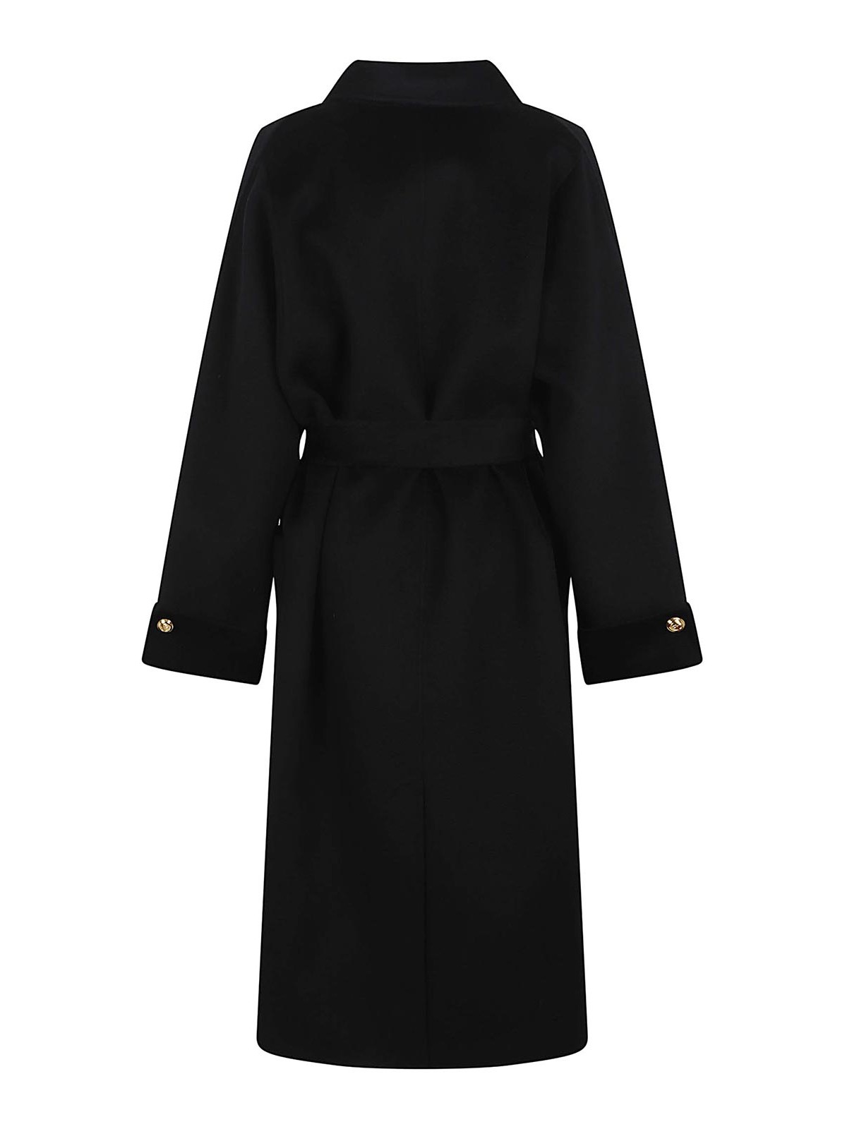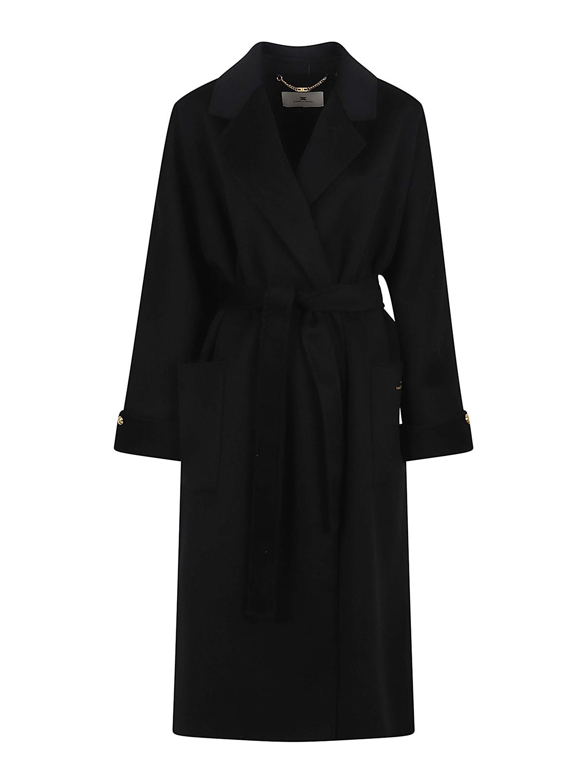 Elisabetta Franchiのダブルウール混紡ラップコート。ラペル、カフスリーブ、パッチポケット、ソフトなウエストラインを実現するベルトクロージャー、袖口にはロゴラベルとゴールドトーンのメタルボタンが付いています。