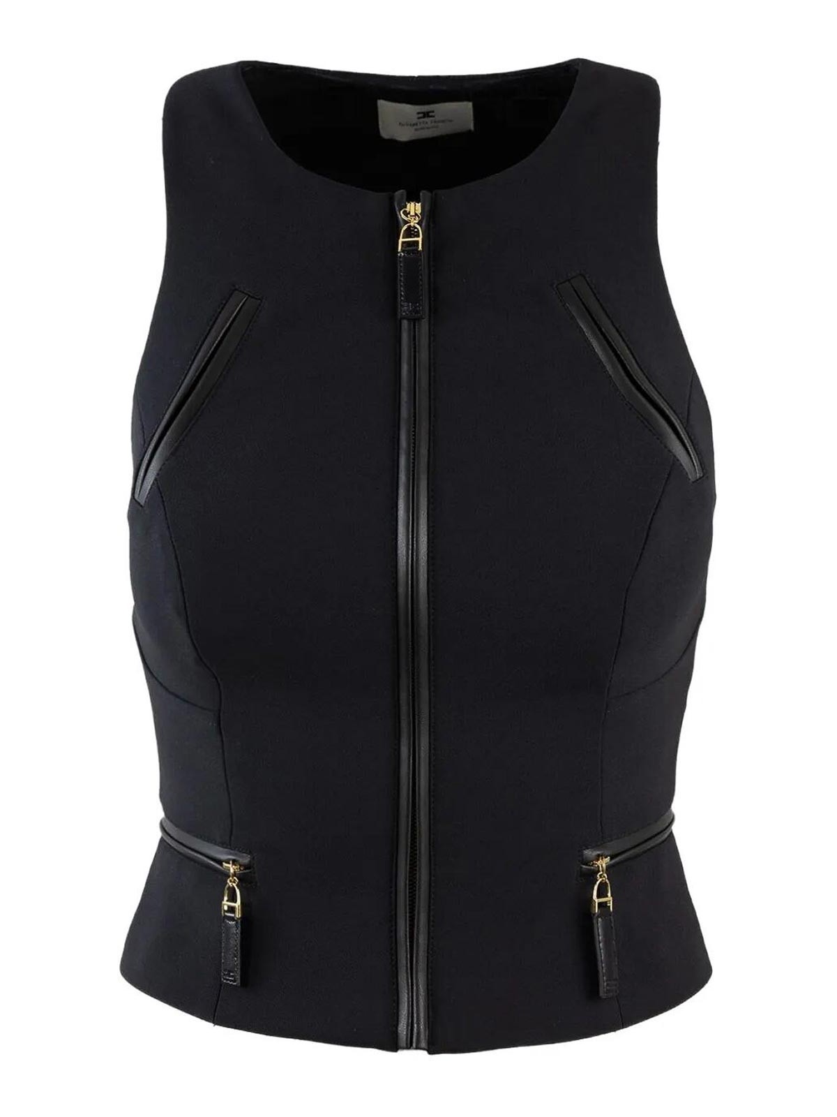 ブラック、フロントジッパー、ノースリーブ、ラウンドカラー、ジップポケット2つ、ベローズポケット2つ