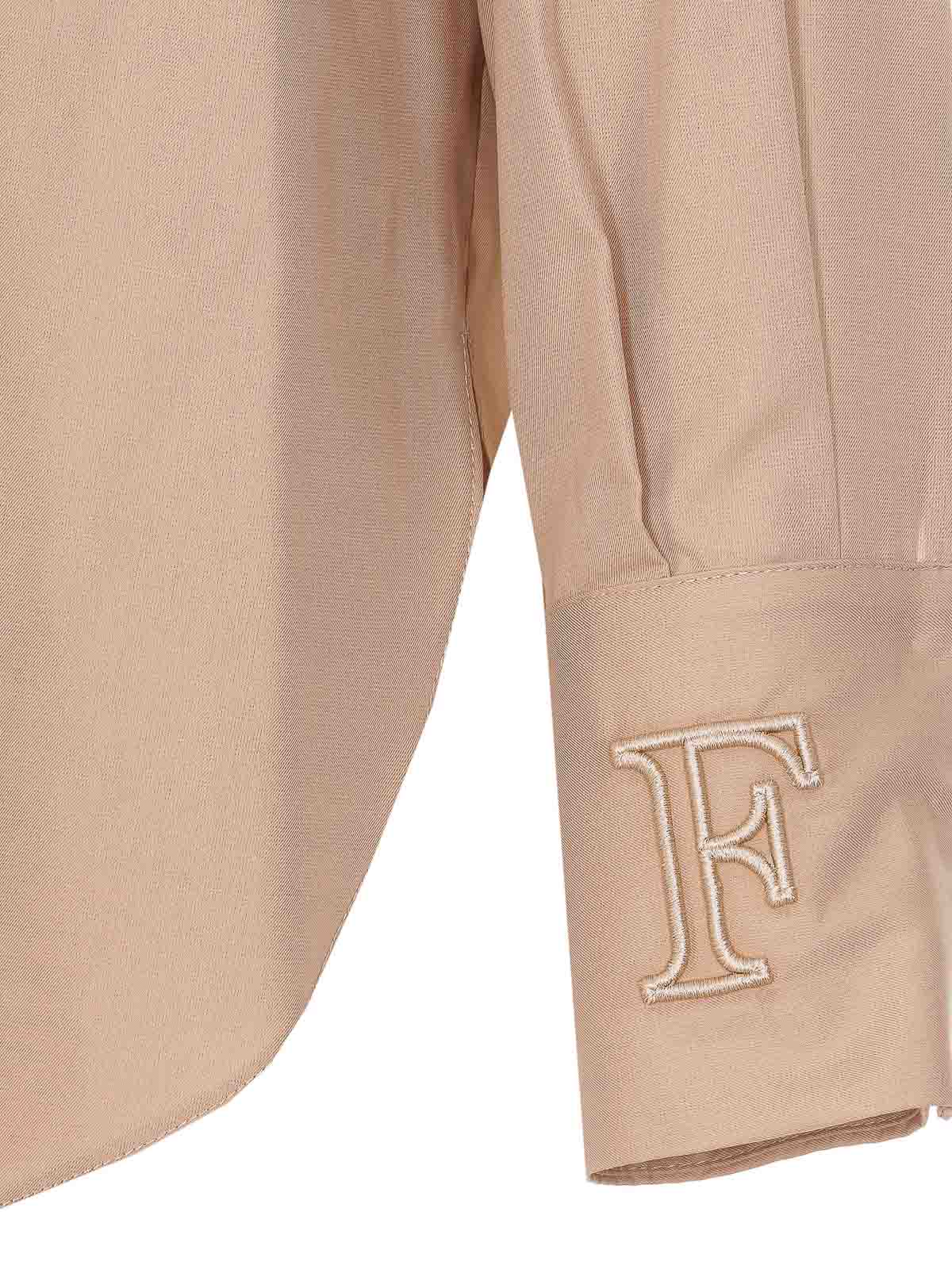 Elisabetta Franchi ベージュシャツ、フロントボタン留め、レギュラーカラー、ネクタイディテール、ロングスリーブ、カフスに刺繍、カフスにボタン