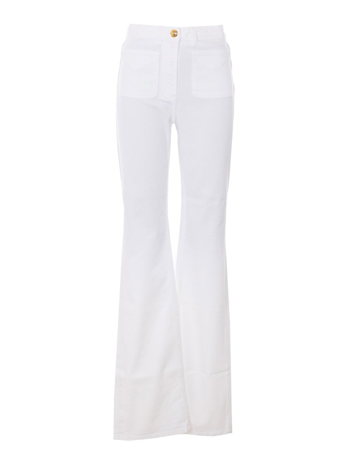 Elisabetta Franchi ホワイトデニムパンツ、ロゴボタン、ジッパー、ポケット5つ、スキニーフィット、ストレートモデル