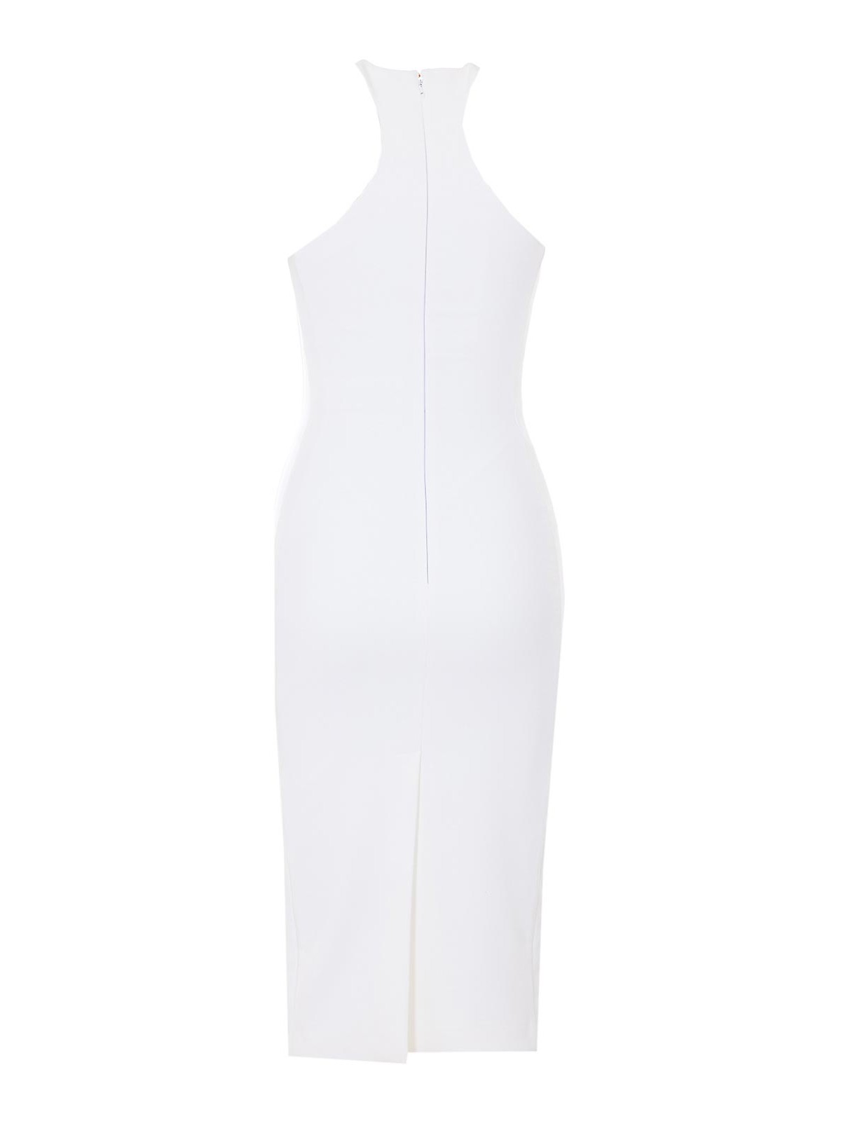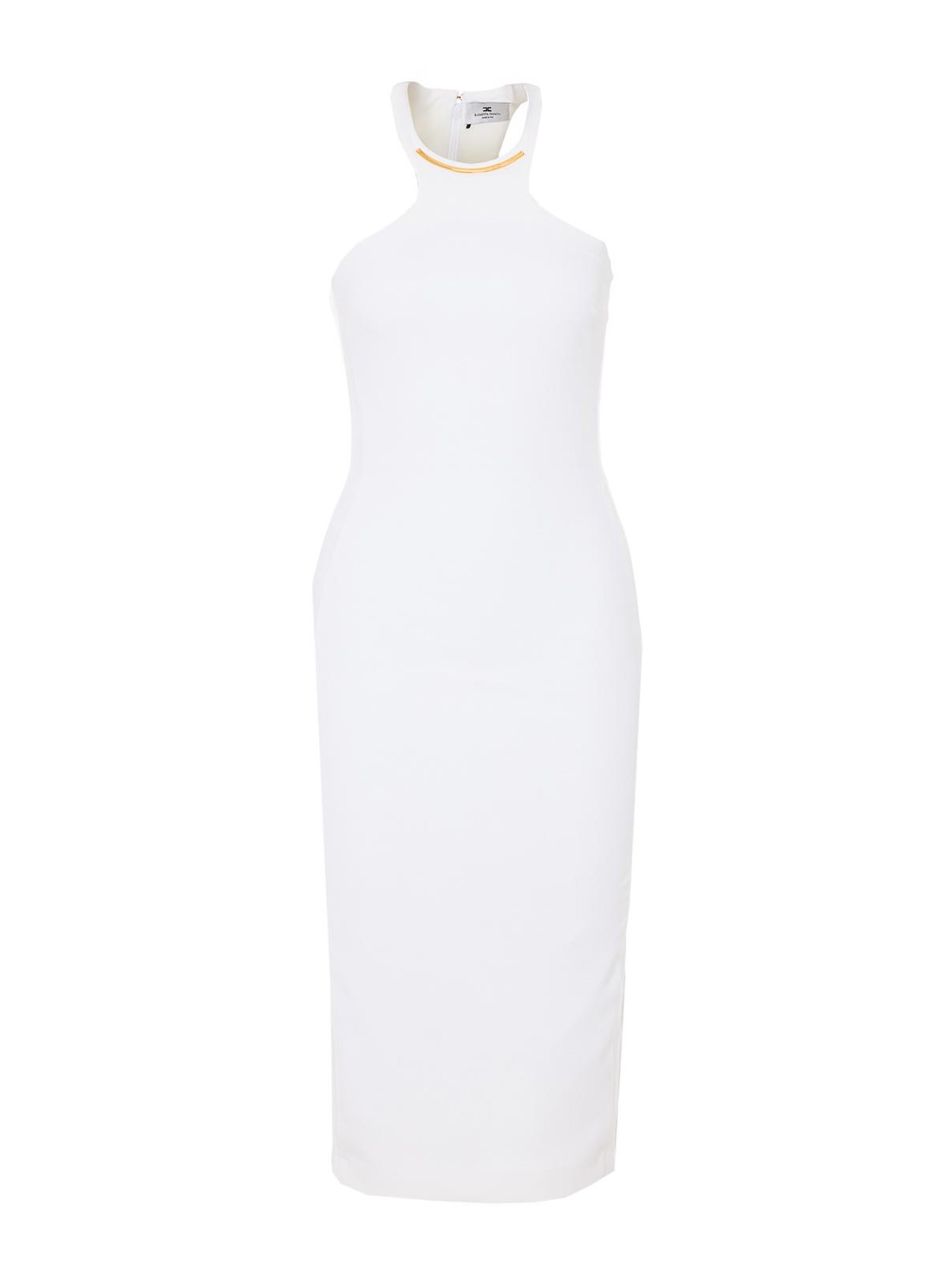 Elisabetta Franchiの白いドレス、ホルターネック、背面にファスナーとフッククロージャー、ノースリーブ、タイトフィット、ミディモデル、背中にスプリット