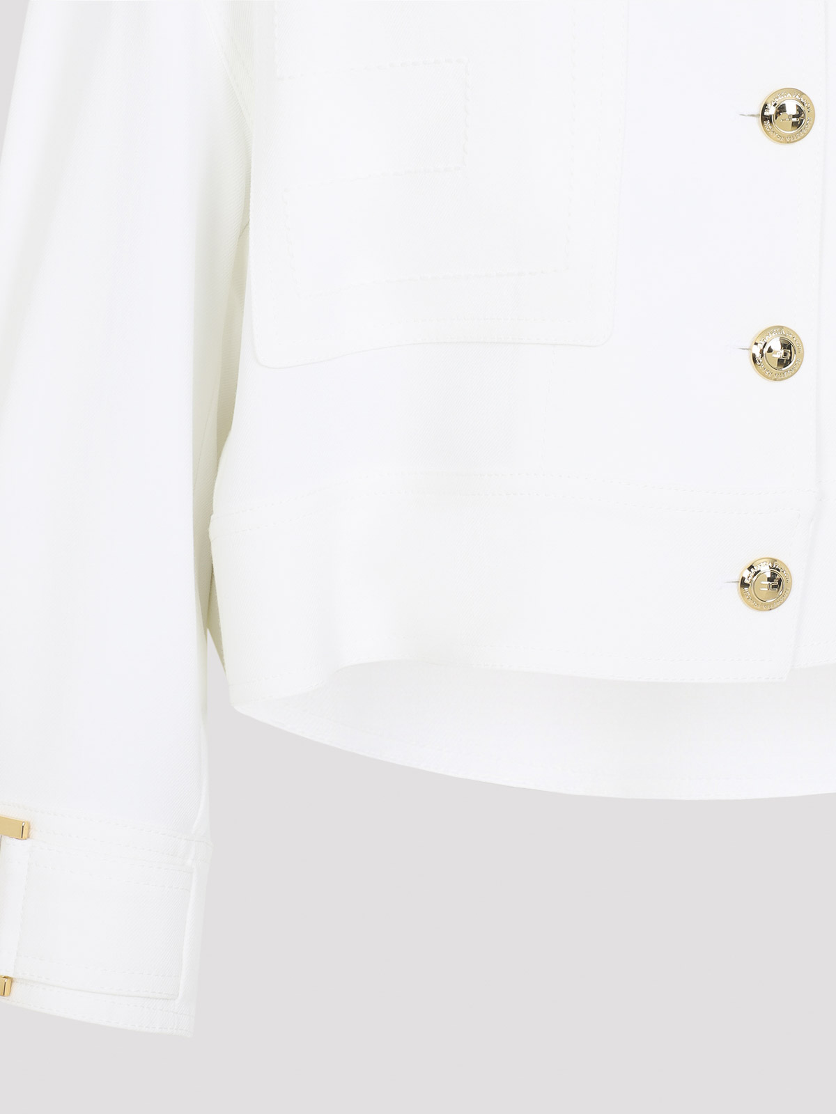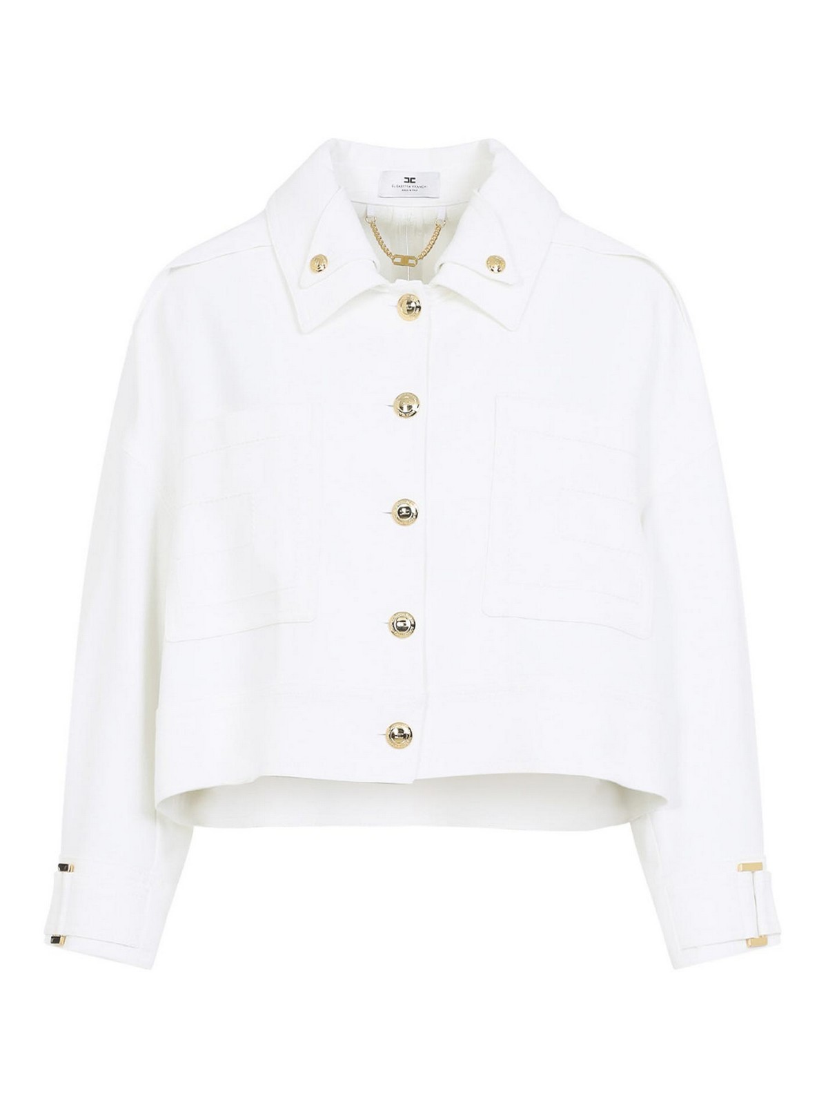 Elisabetta franchi アイボリーホワイトのボクシージャケット。ビスコースとエラステインのブレンドで作られています。ゴールドトーンのボタンディテールが施された先のとがったダブルカラー、フロントボタン留め、胸ポケット、長袖、ボタン付きカフス、アシンメトリックヘム。ゴールドトーンのハードウェア。