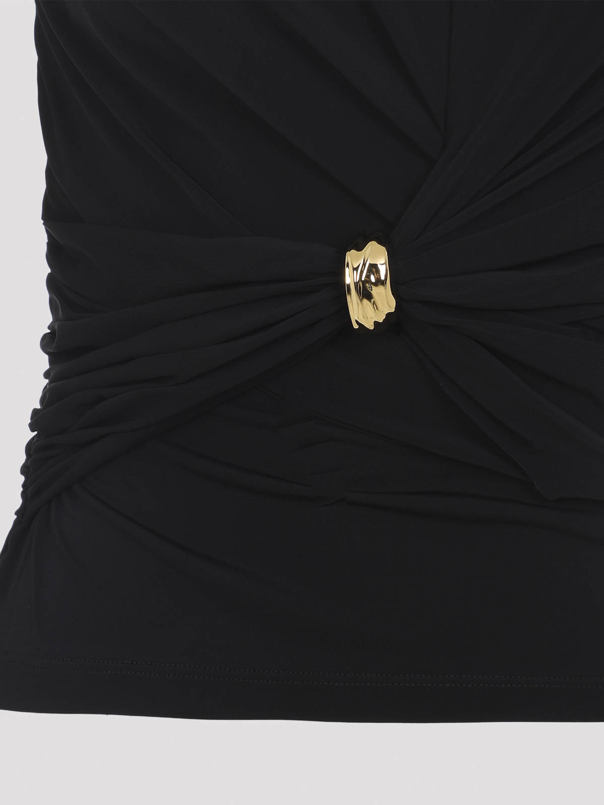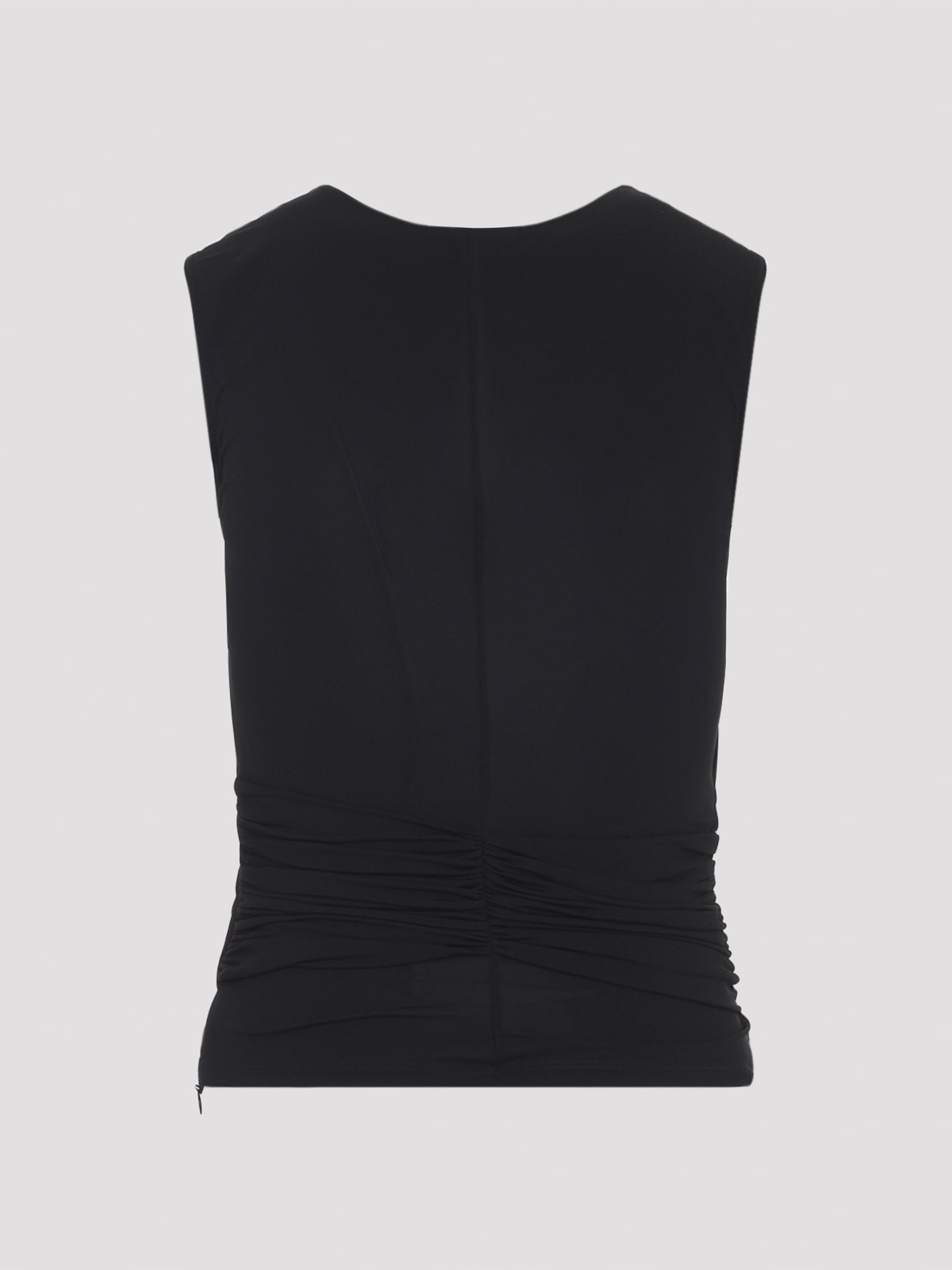 Elisabetta franchiのブラックトップ。ビスコースとエラステインのブレンドで作られています。ラウンドネック、ノースリーブ、フロントドレープエフェクト、フロントはゴールドトーンのメタリックディテール、サイドジッパー留め、ストレートヘム、バック透明ディテール。
