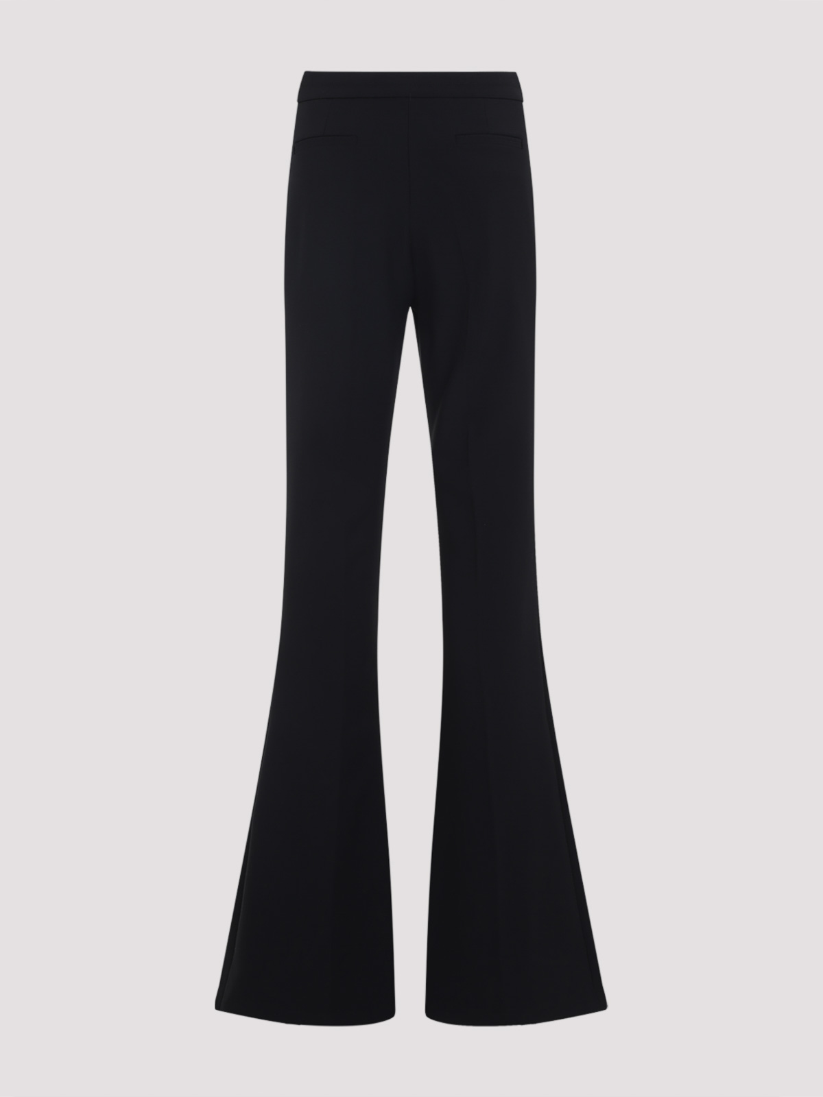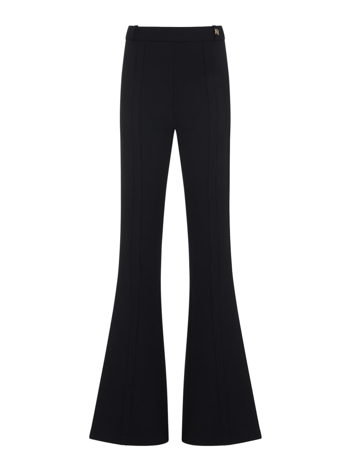 Elisabetta franchi フレアブラックポリアミドパンツ。ブラックテックファブリック製のハイウエストパンツ。ベルトループ、隠しファスナー、ウエストにメタルロゴのディテール、中央にステッチを施した折り目、フレアレッグが特徴です。