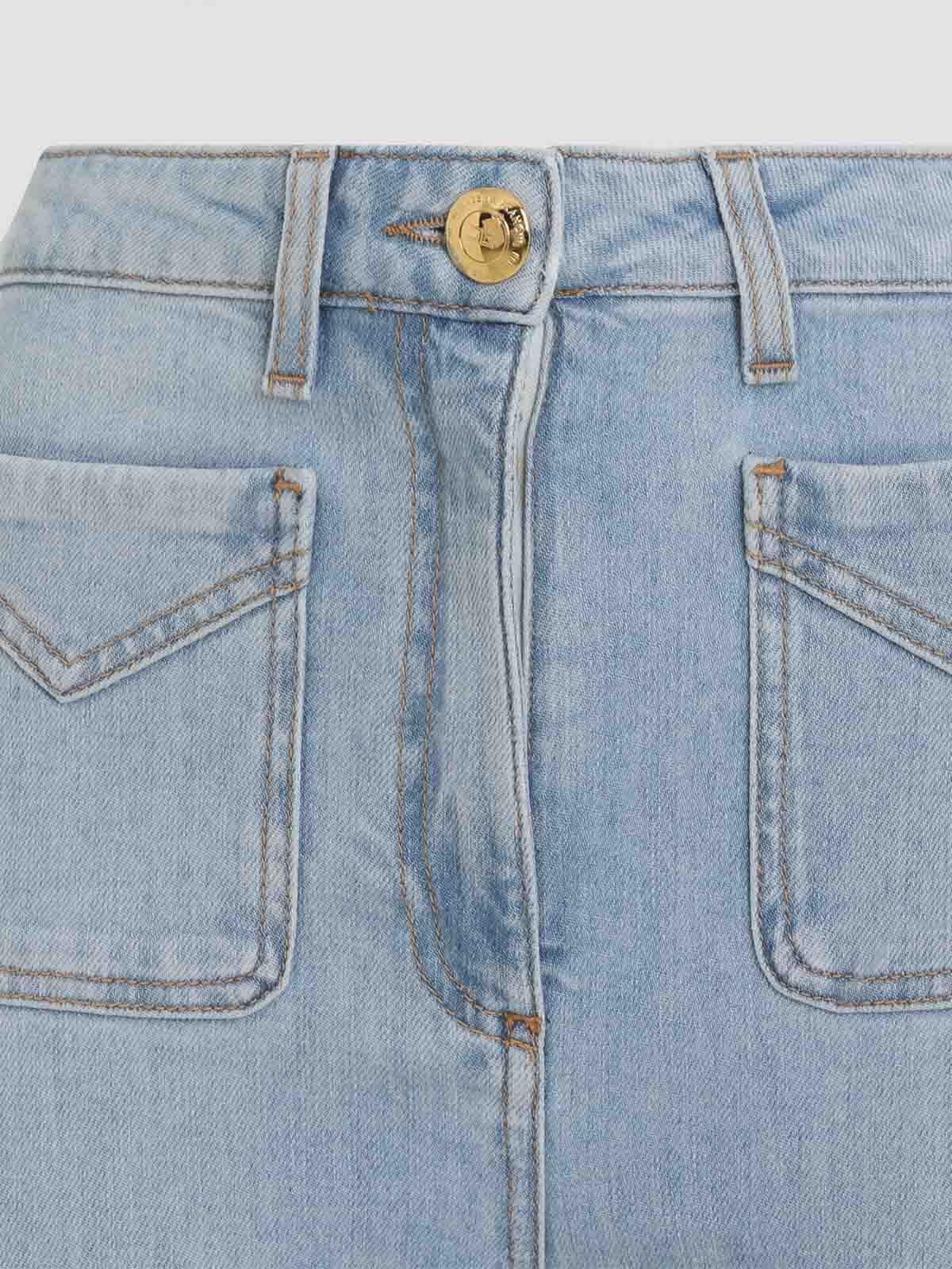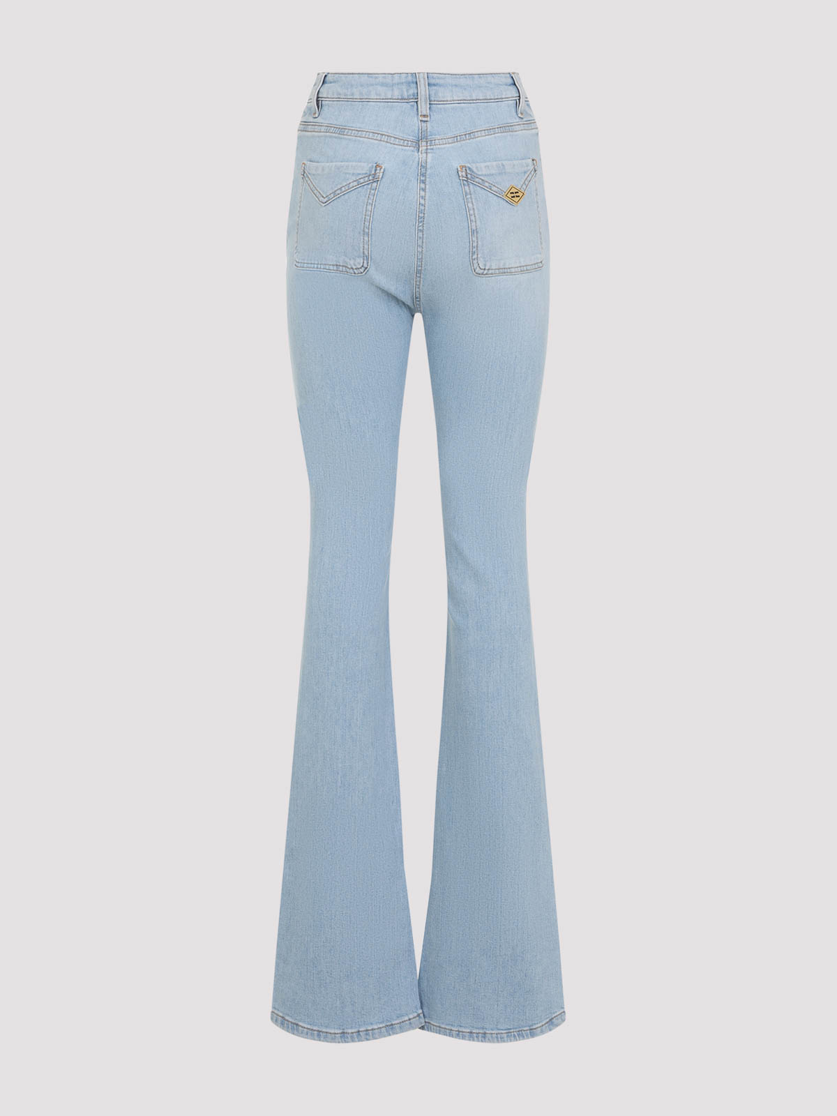 Elisabetta franchiブーツカットのライトブルーコットンジーンズ。ライトブルーのコットンデニム製のハイウエストジーンズ。ベルトループ、フロントボタン、ジップフライファスナー、フロントとバックにフラップポケット、バックにゴールドトーンのメタルロゴプレート、ストレートレッグが特徴です。
