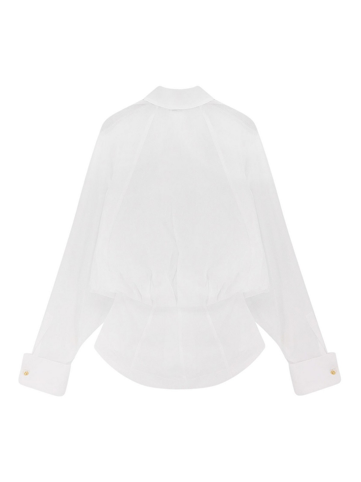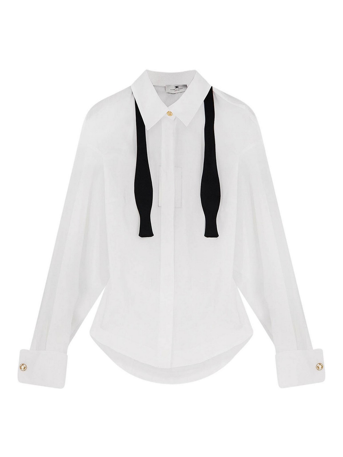 蝶ネクタイのディテール、先のとがった襟、隠しボタン留め、ダブルカフスとカフスボタン付きのロングスリーブ。