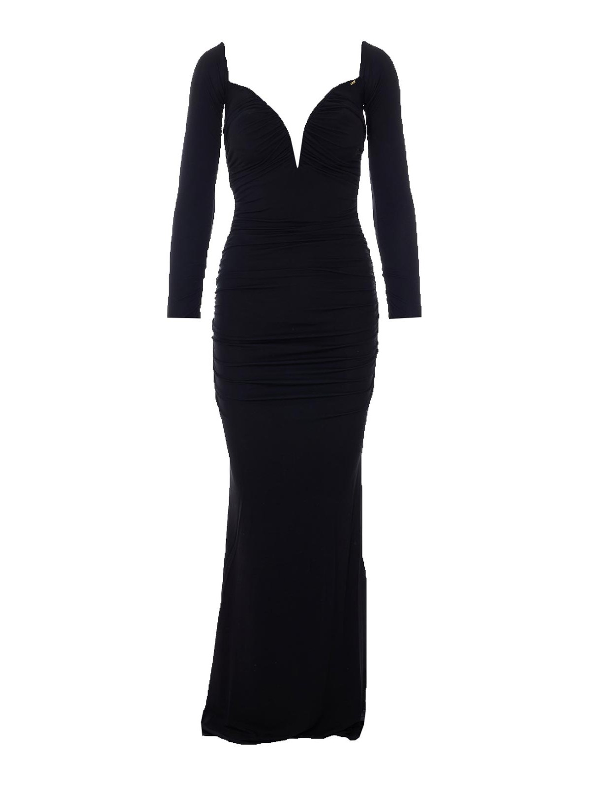 Elisabetta franchi ブラックレッドカーペットドレス、ファスナーとフッククロージャー、ロングスリーブ、ハートネック、タイトで伸縮性のあるフィット、ロングモデル、ロゴ