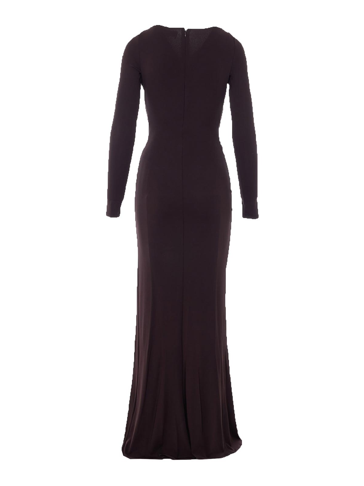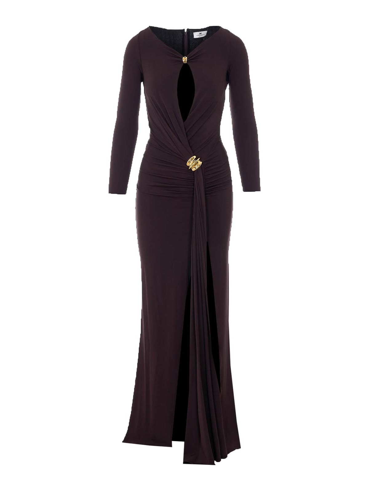 Elsiabetta franchi ブラウンレッドカーペットドレス、ジッパーとフッククロージャー Vネック、フロントにカットアウトディテール、フロントにノットのディテール、ロングスリーブ、タイトで伸縮性のあるフィット