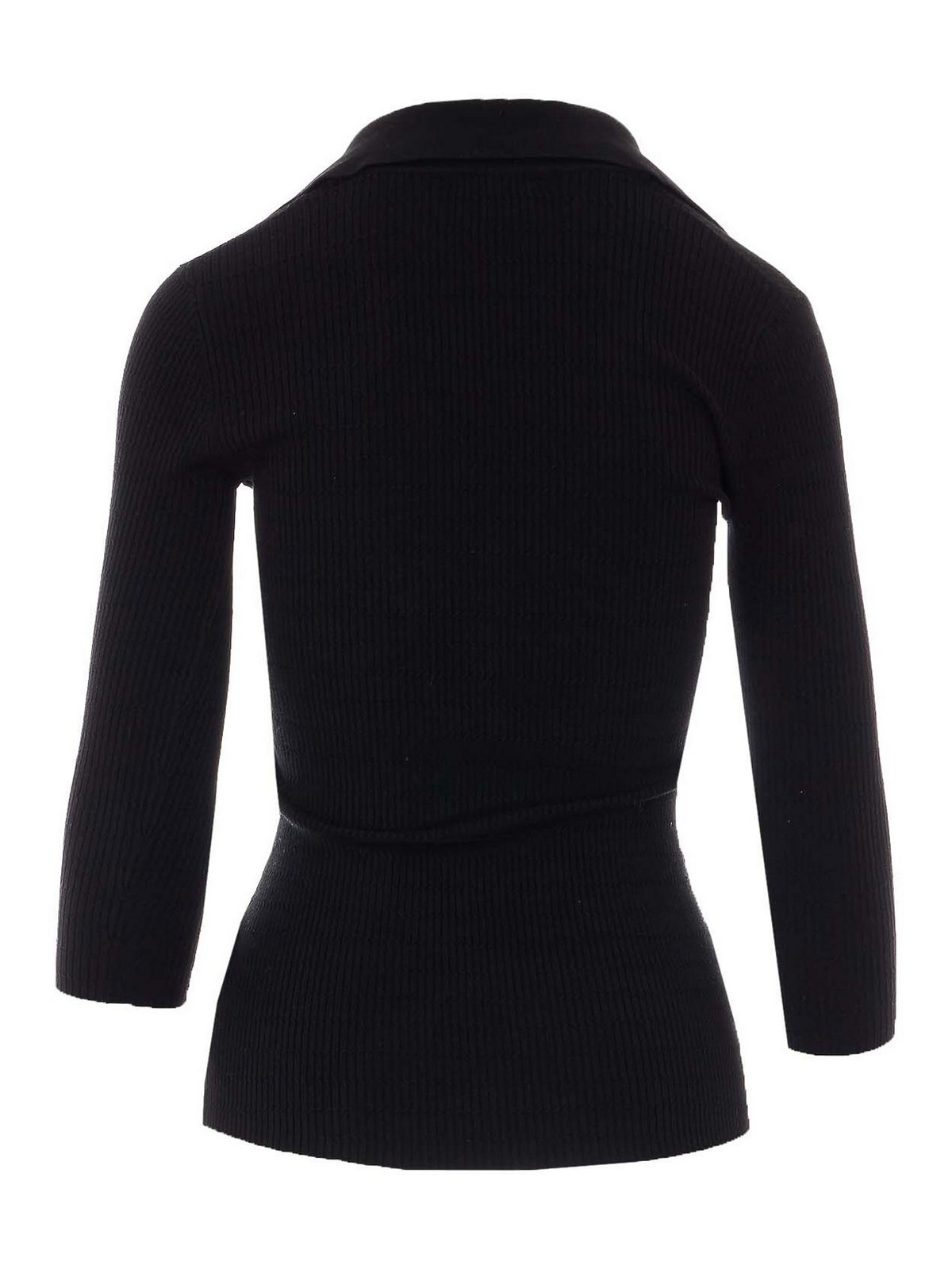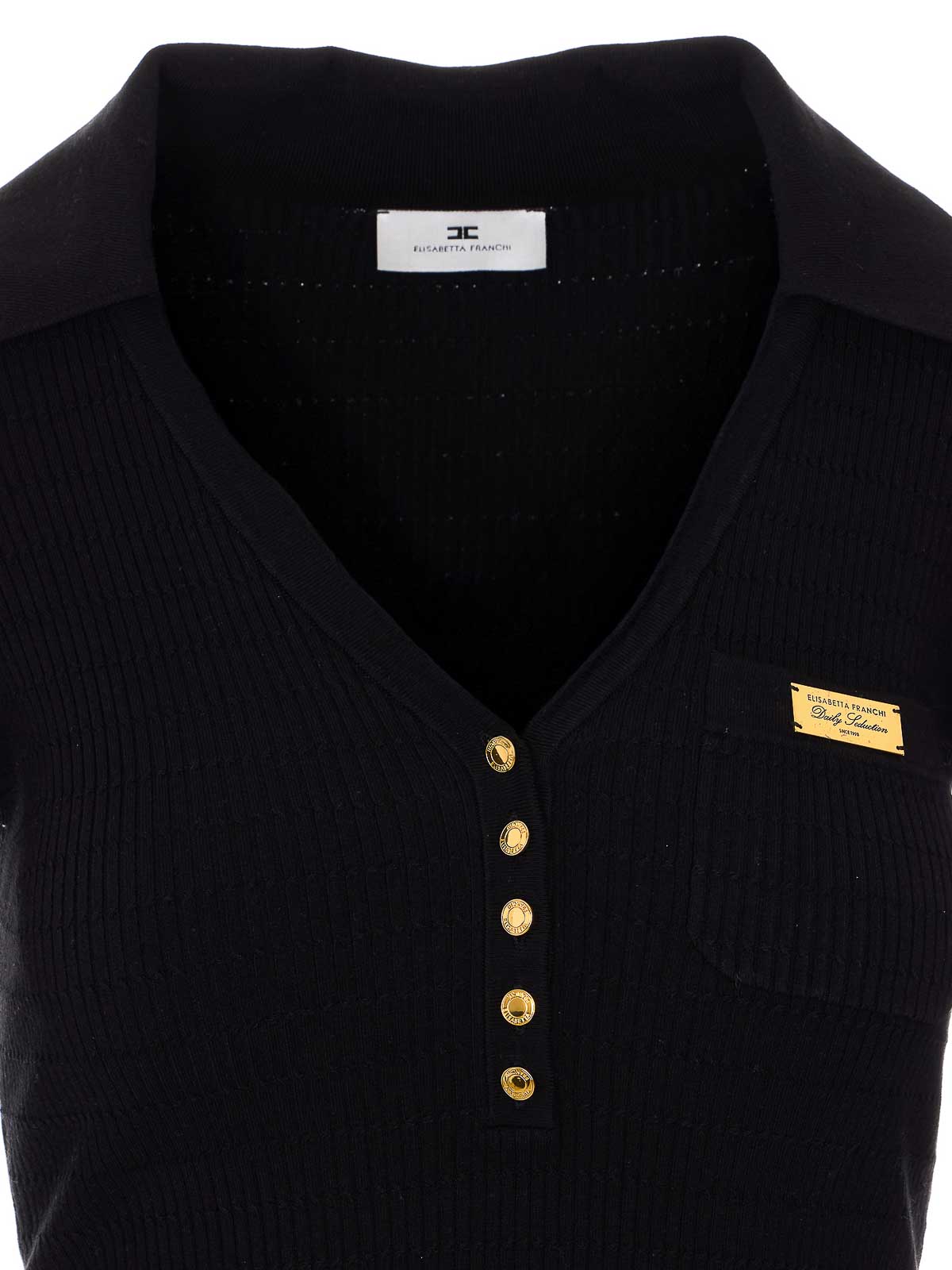 Elisabetta Franchi ブラックトップ、Vネック、襟、前面にボタンディテール、プラークロゴ入りポケット、ショートスリーブ、ショートスリーブ