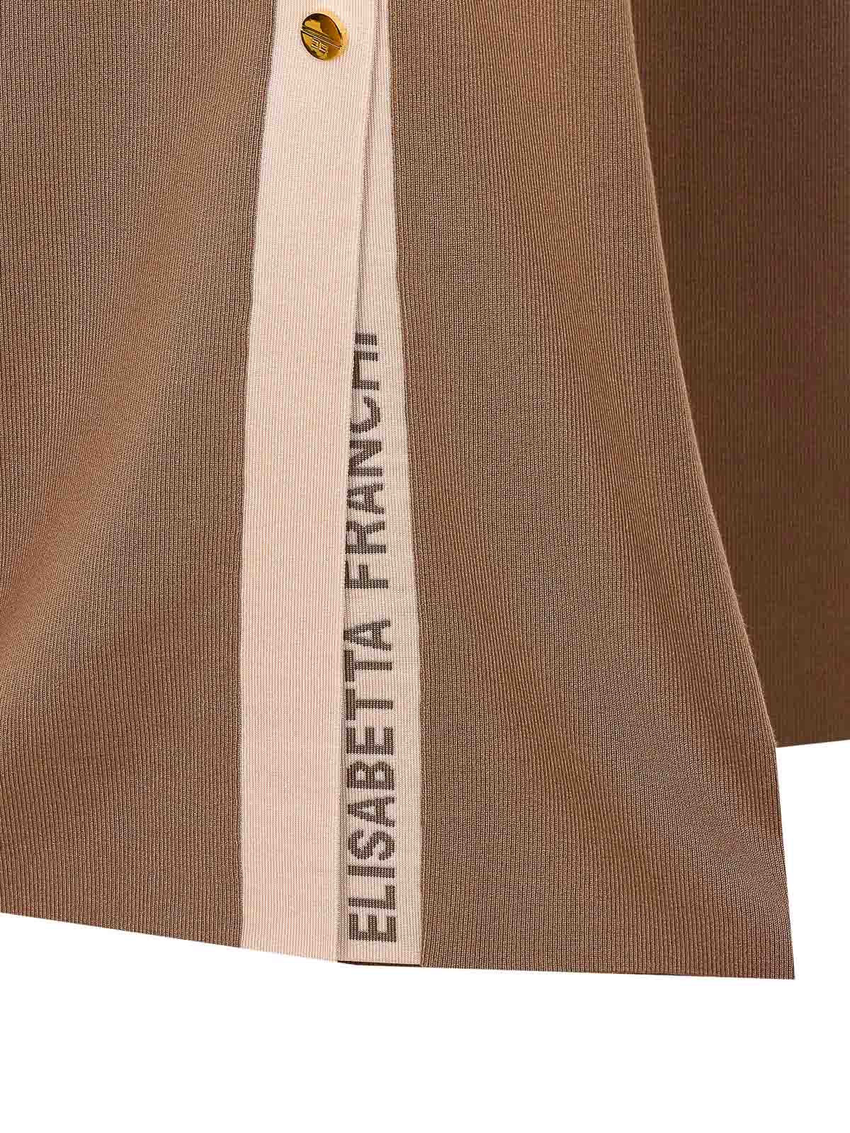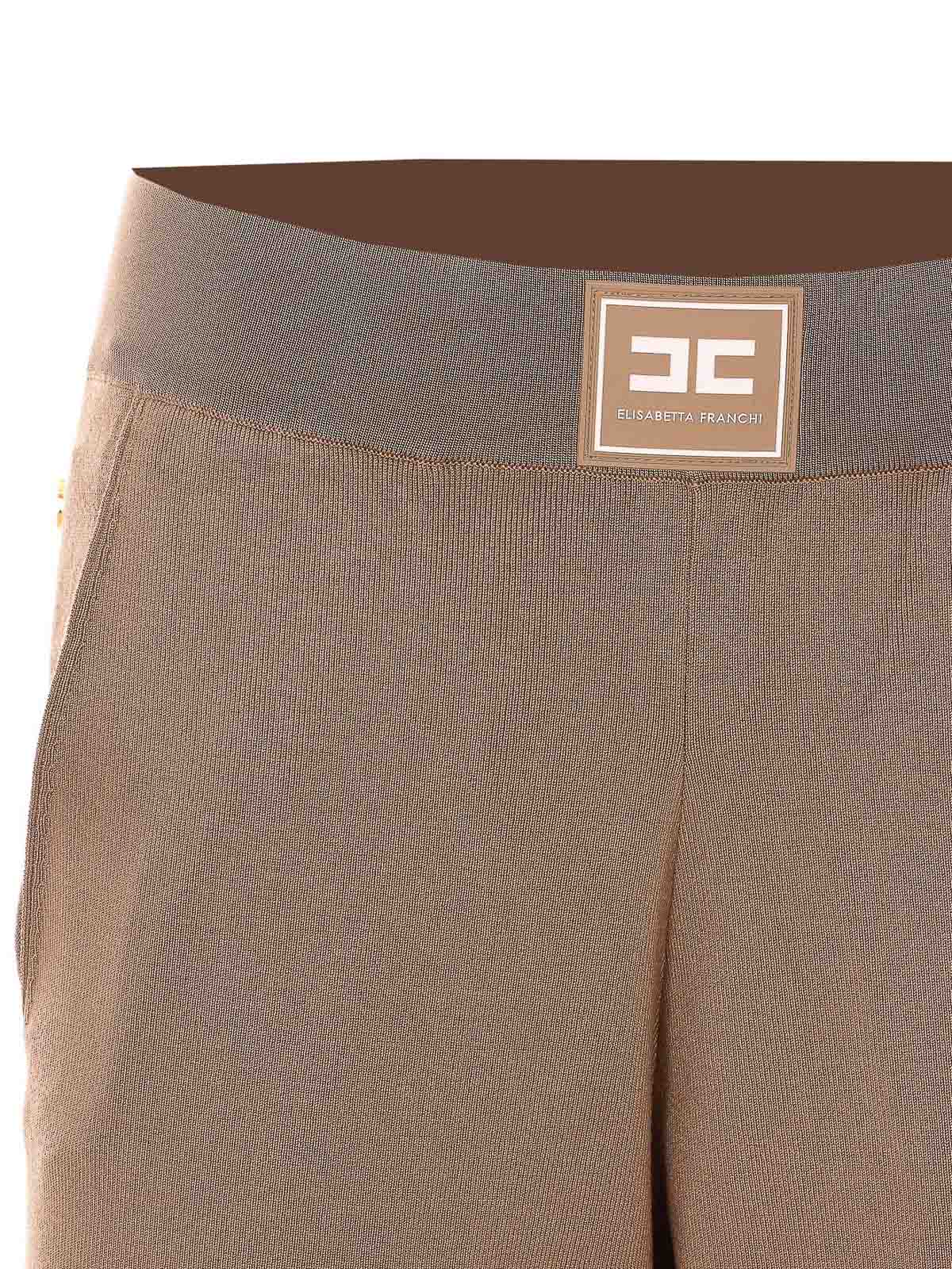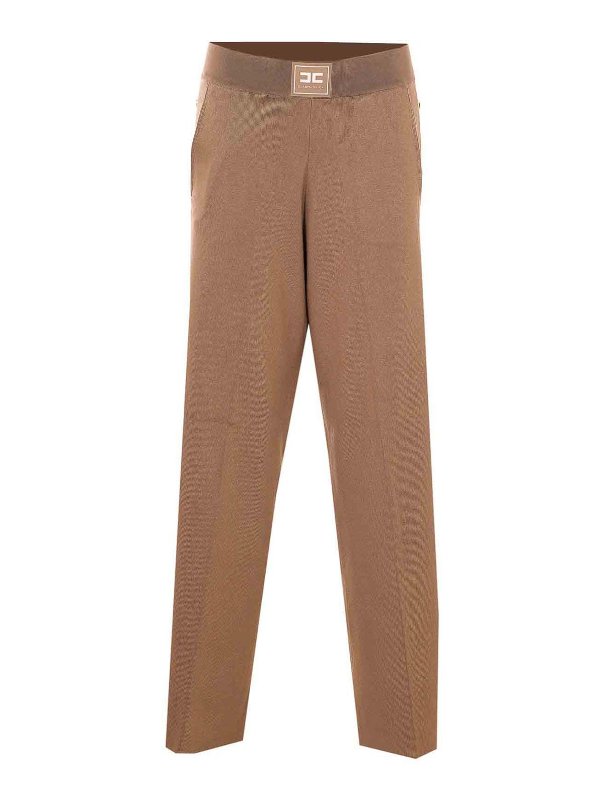 Elisabetta Franchi ベージュパンツ、ハイウエスト、前面にパッチロゴ、横にボタンディテール、横ポケット、伸縮性のあるフィット