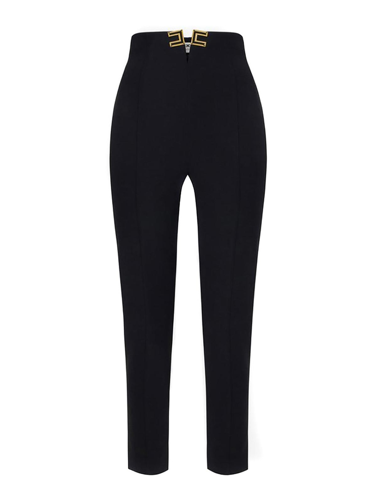 Elisabetta Franchiのダブルストレッチクレープパンツ。ウエストの中央にV字型の開口部があり、ゴールドメタルのロゴディテールが施され、内側にはエナメル加工が施され、脚の下部にサイドスリットが入っています。