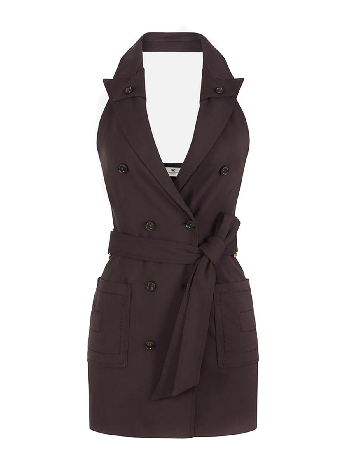 Elisabetta franchiのギャバジンドレス。刺繍入りポケット、ホルターネックライン、ダブルラペルが特徴です。ダブルブレストの留め具で、後ろにサッシが縫い付けられてウエストで結びます。