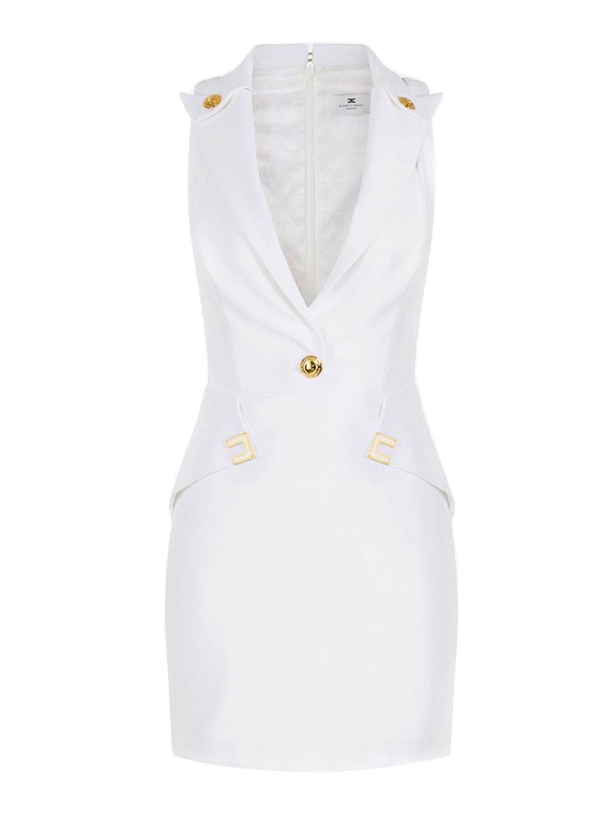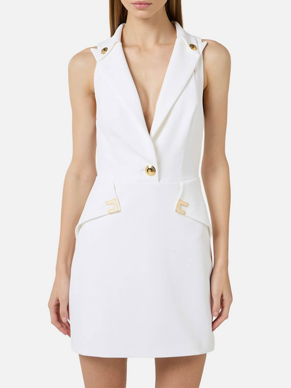 Elisabetta Franchiのミニドレスは、ロゴのディテールをあしらったダブルストレッチクレープで、ストラップとピークドラペルが付いたノースリーブ。スカートはサイドフラップがユニークなシルエットを生み出しています。