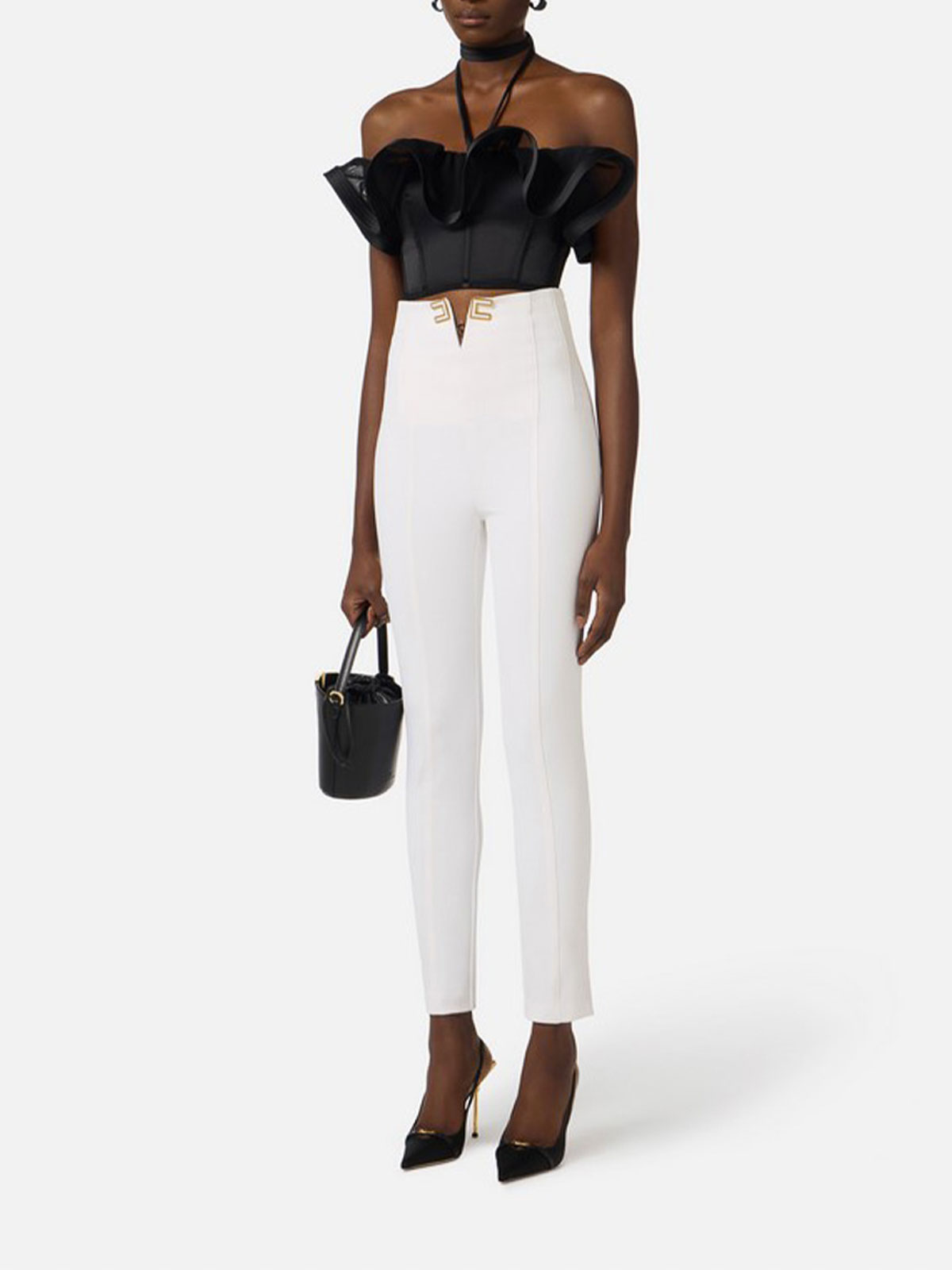 Elisabetta Franchiのダブルストレッチクレープパンツ。ウエストの中央にV字型の開口部があり、ゴールドメタルのロゴディテールが施され、内側にはエナメル加工が施され、脚の下部にサイドスリットが入っています。