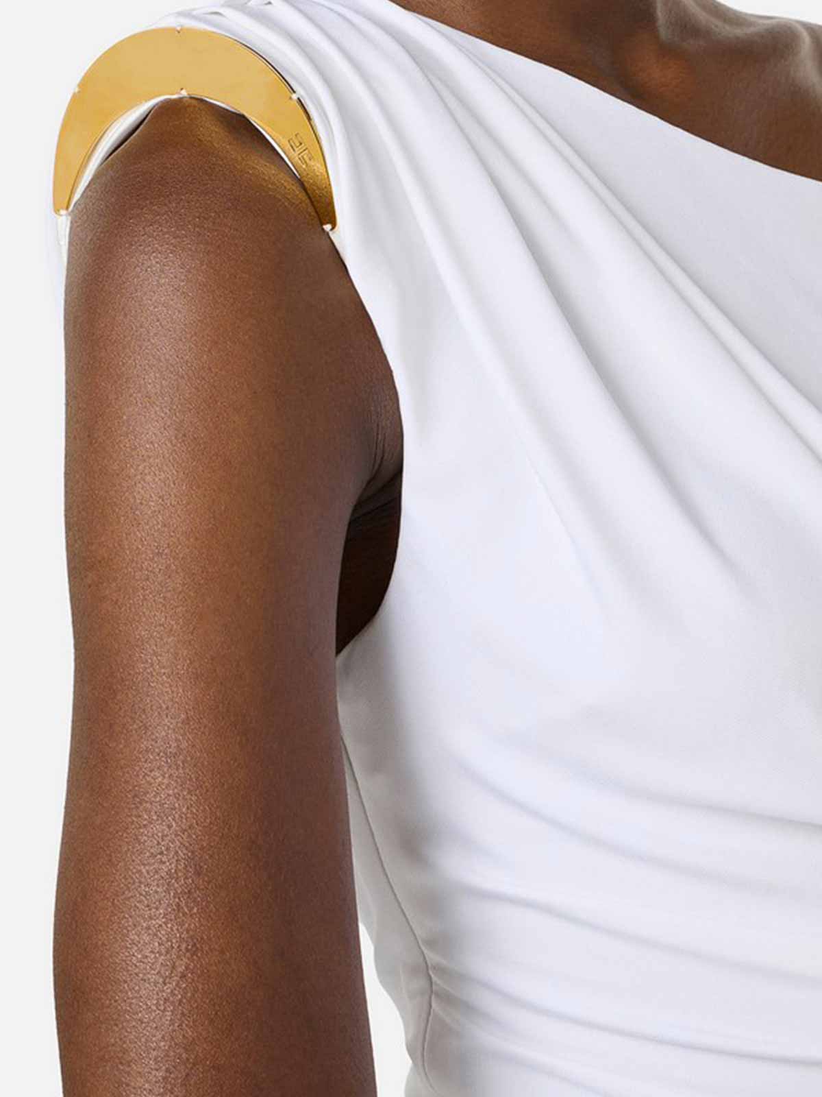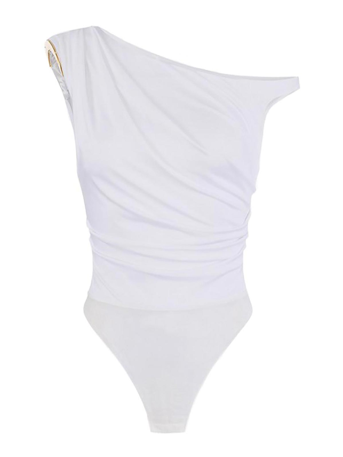 Elisabetta Franchiのジュエリー付きショルダー付きジャージーボディスーツ。立体的なワンショルダーデザインが特徴で、金色の金属三日月で留めればキラキラと輝きます。