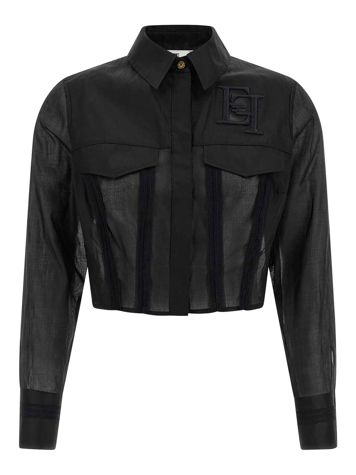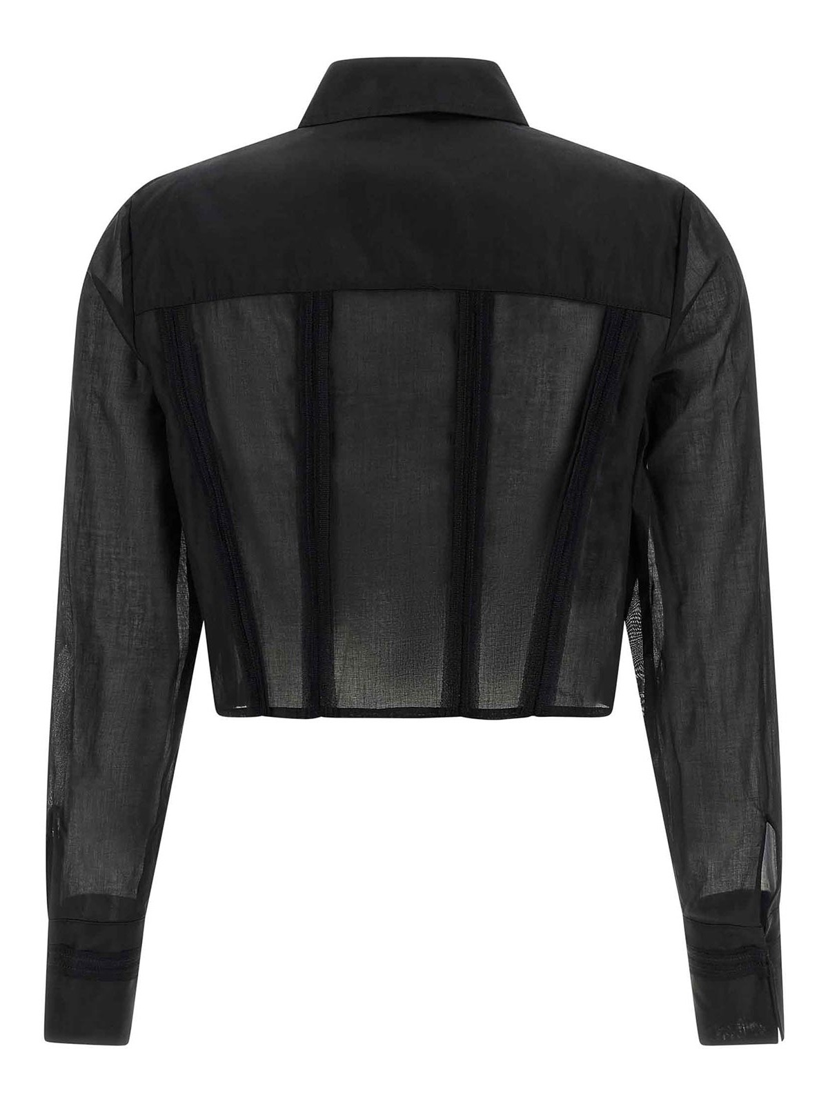 同系色のトリミングが施された半透明のライトコットンシャツ、クロップモデル、マキシトーンオントーンのロゴ刺繍、隠しフロントボタン留め、ロングカフスリーブ。