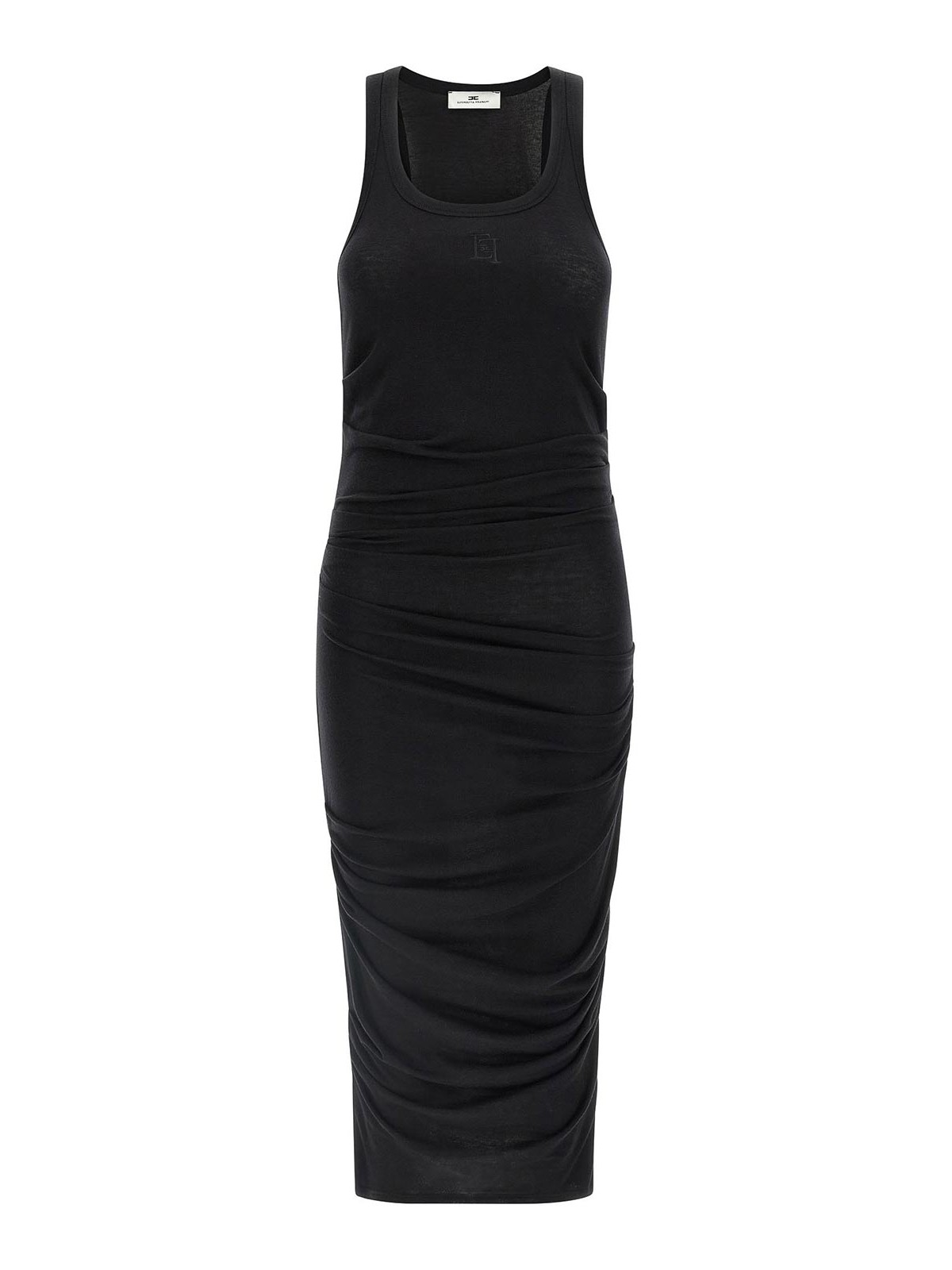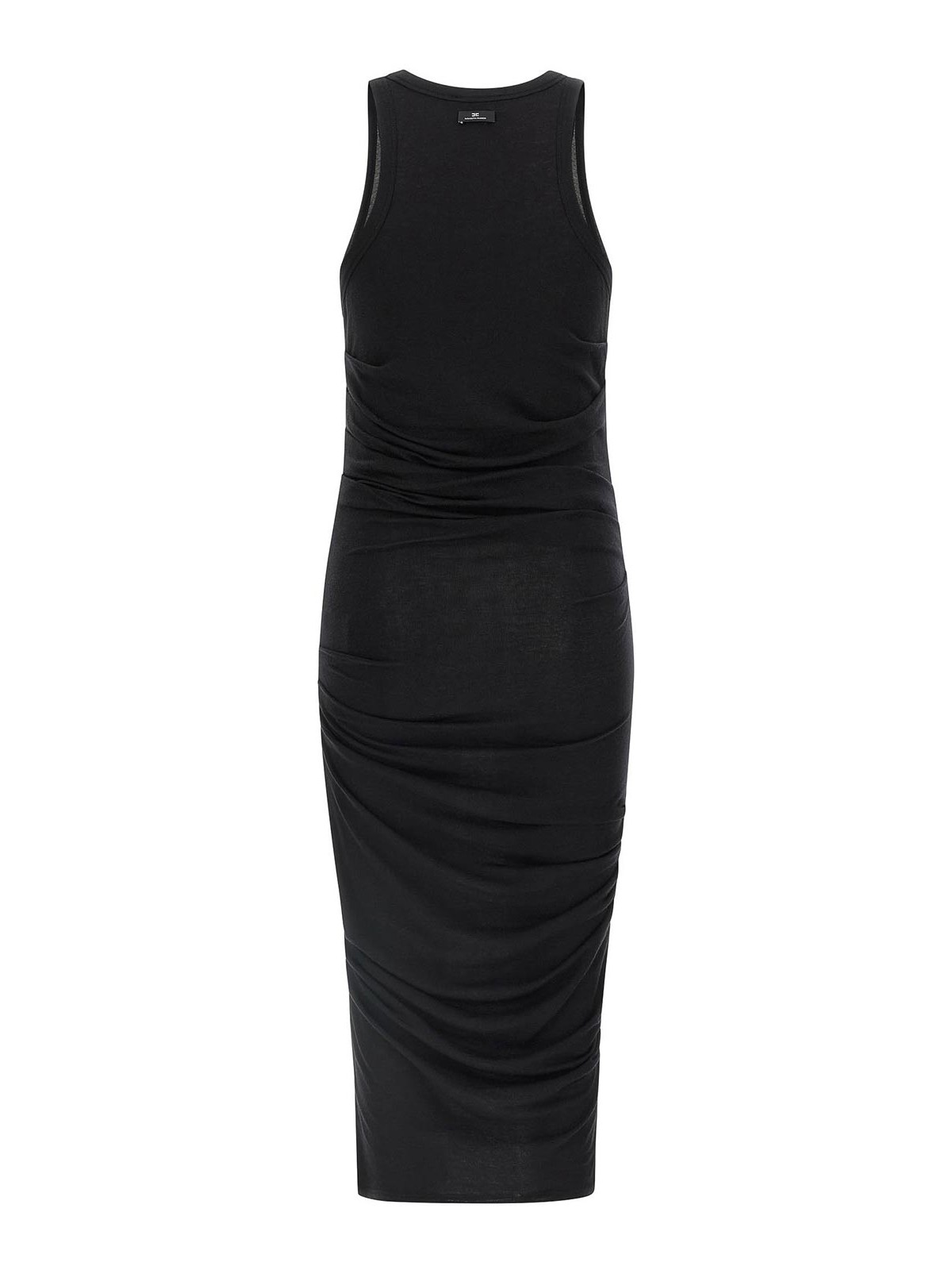 薄手の半透明ジャージーを使用したミディドレス、スクエアネックライン、前面にトーン・オン・トーンのロゴ刺繍、ノースリーブ、サイドドレープ付き。