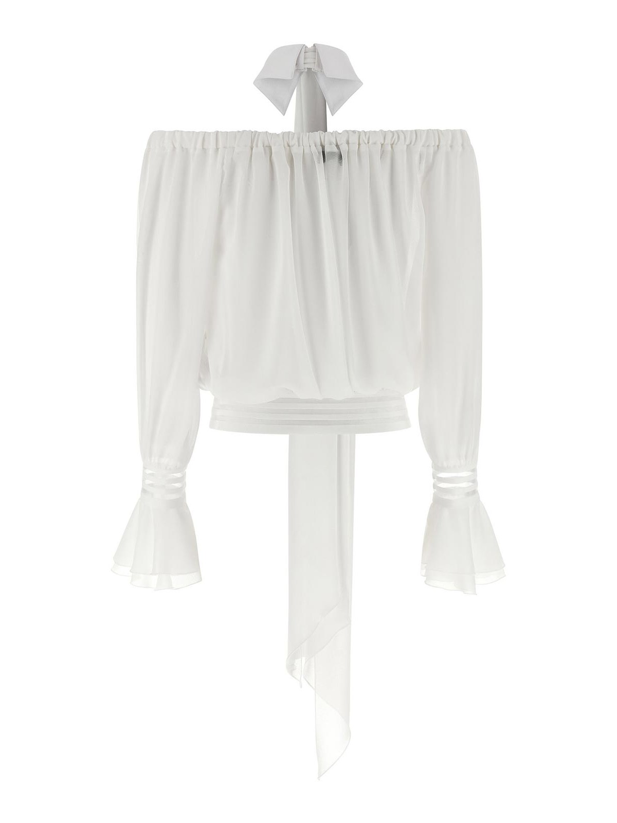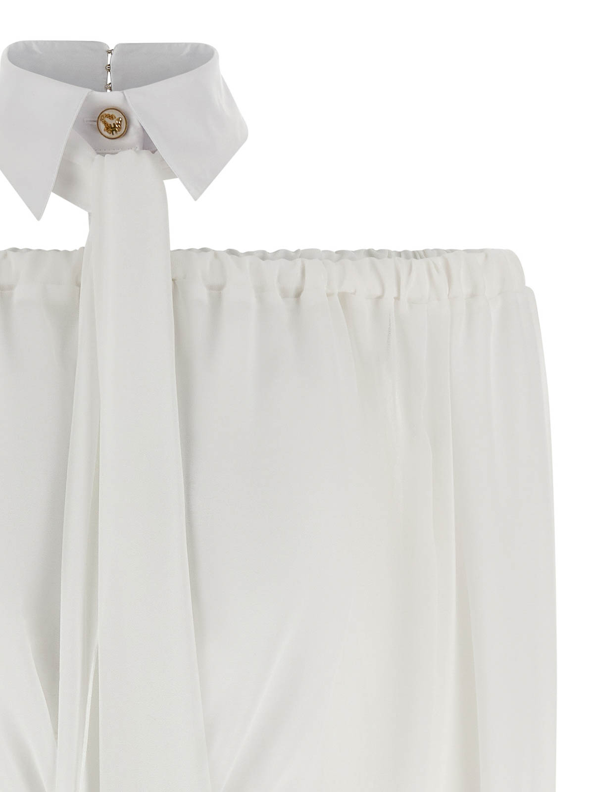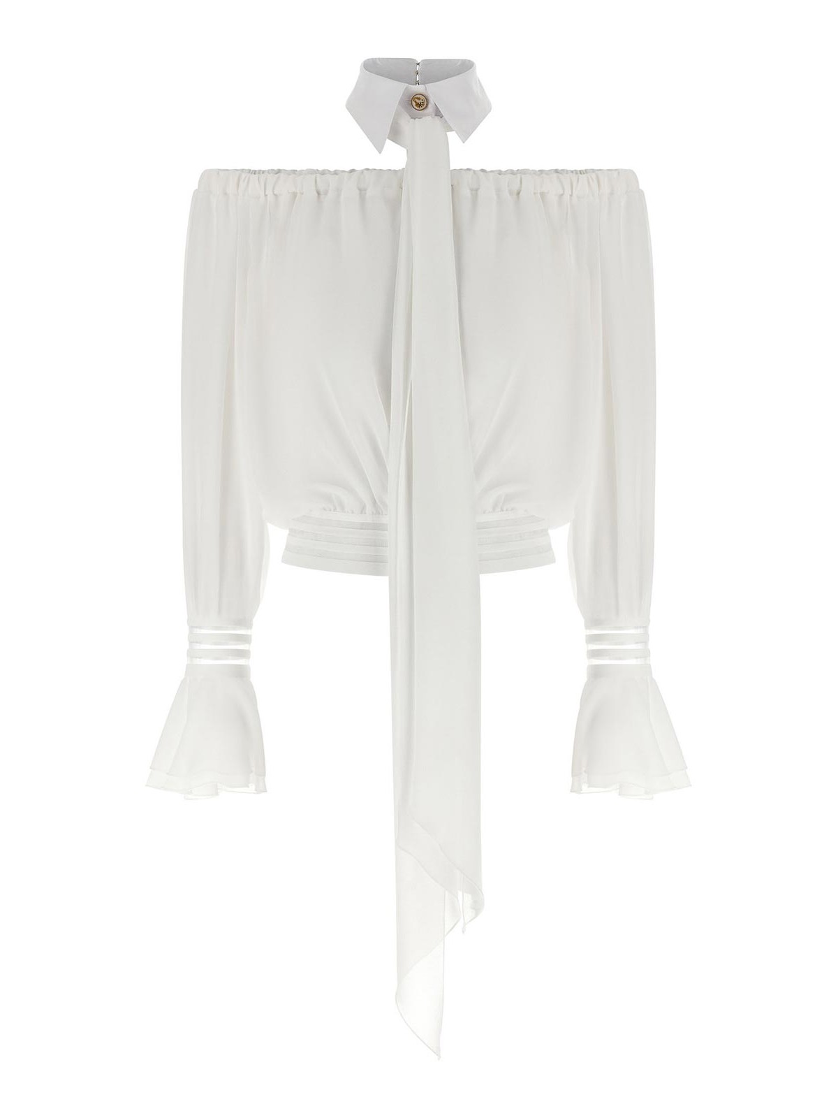 上部にゴムバンドが付いたオフショルダーの半透明ファブリックブラウス、フロントジュエルボタン付きのトーナルファブリックシャツカラー、取り外し可能なサッシュ生地、クロップモデル、袖口付きロングスリーブ、フリルスリーブ、裾にゴムバンド。
