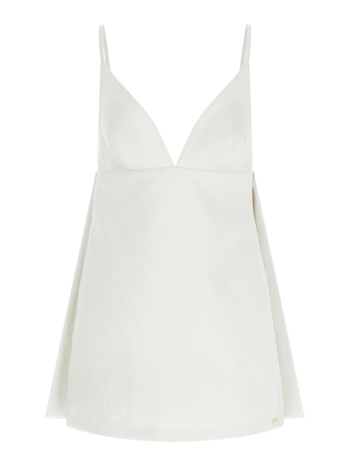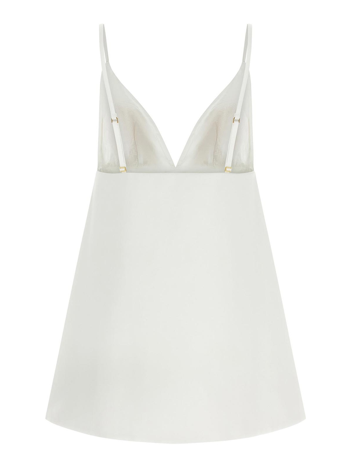 Duchesse ミニドレス、バックケープ構造、ワイドフロントVネック、細く調節可能なストラップ、ノースリーブ、ワイドバックネック、サイドジッパー、モノグラムサテンの裏地付き。