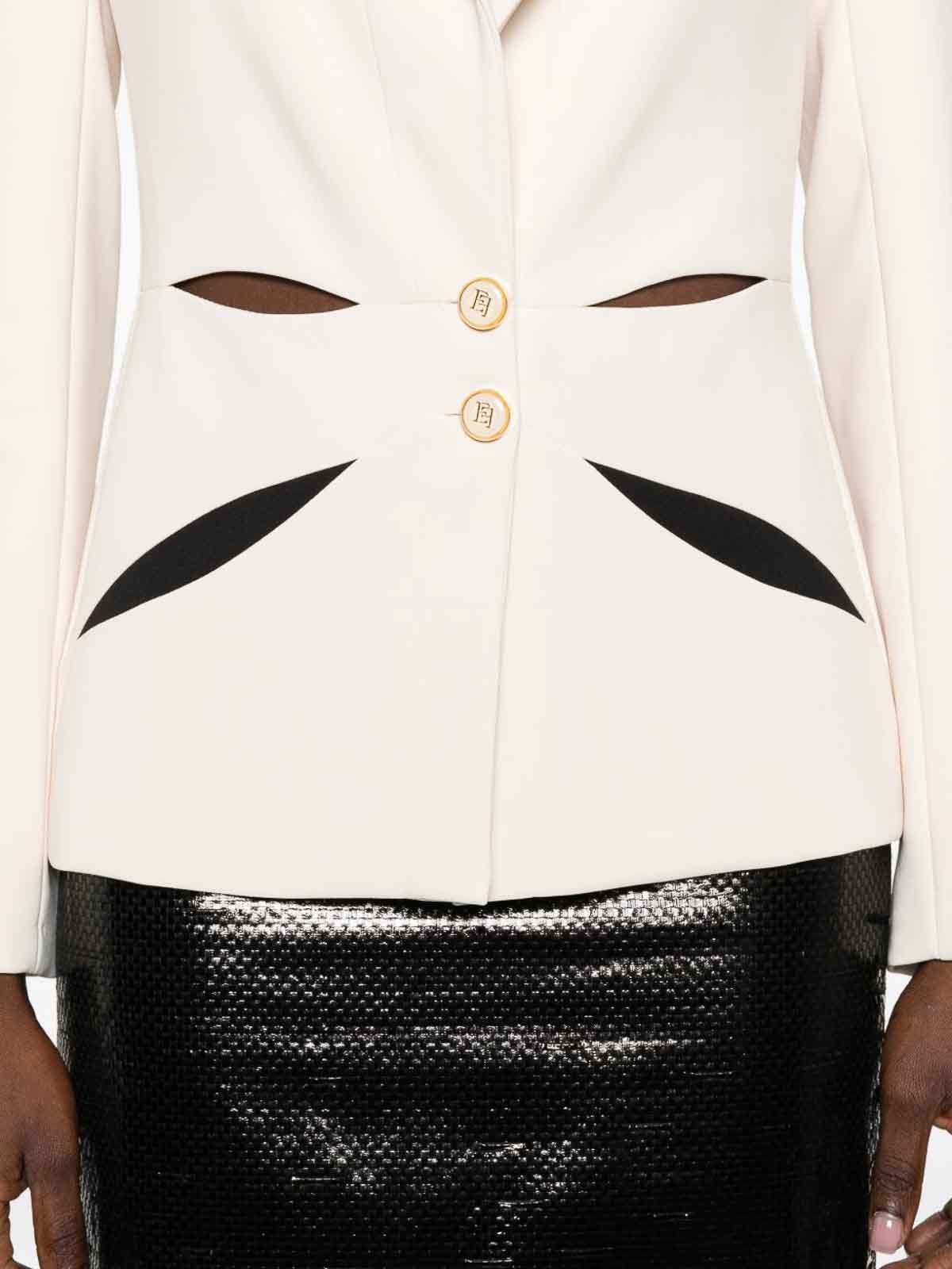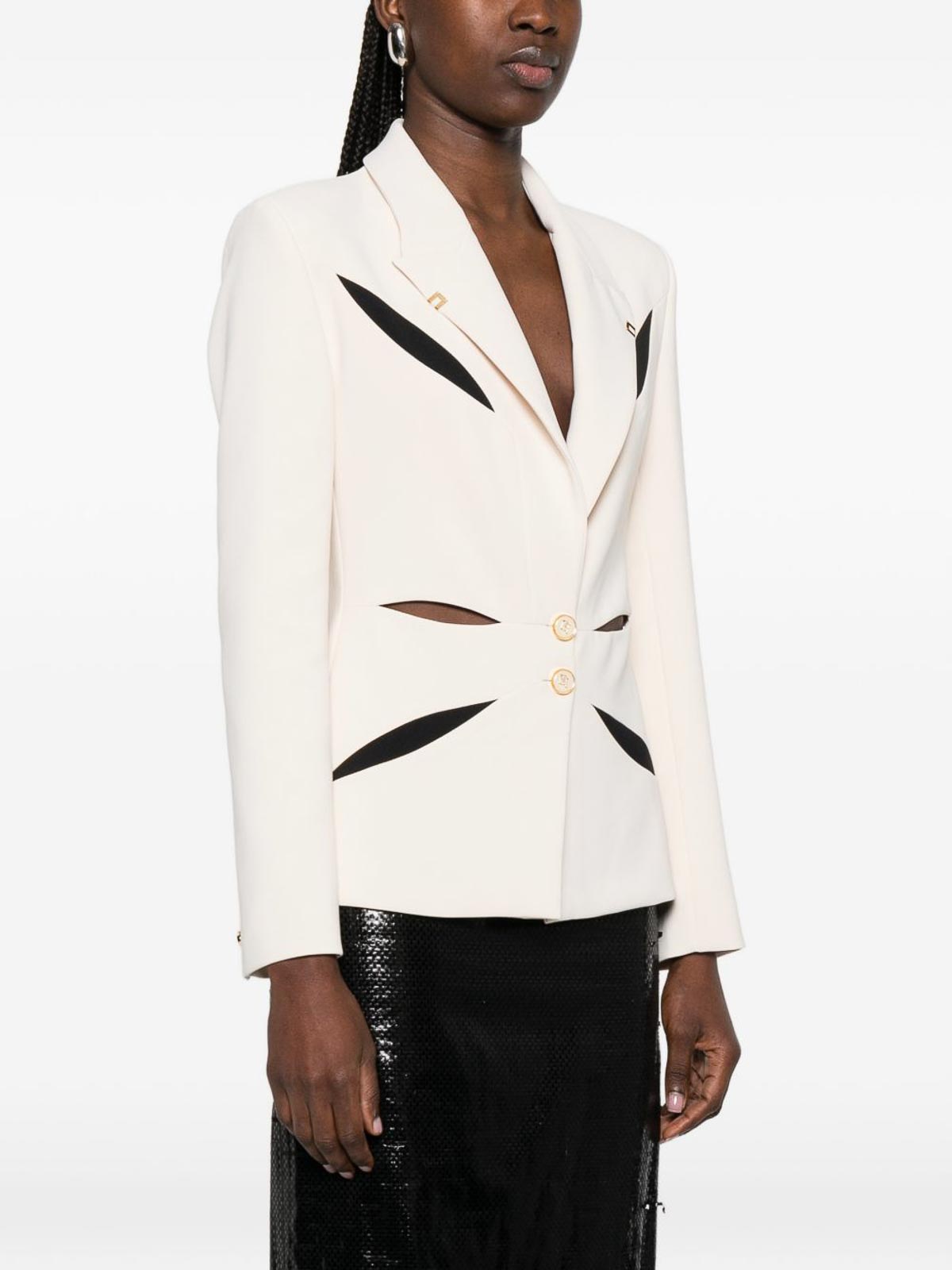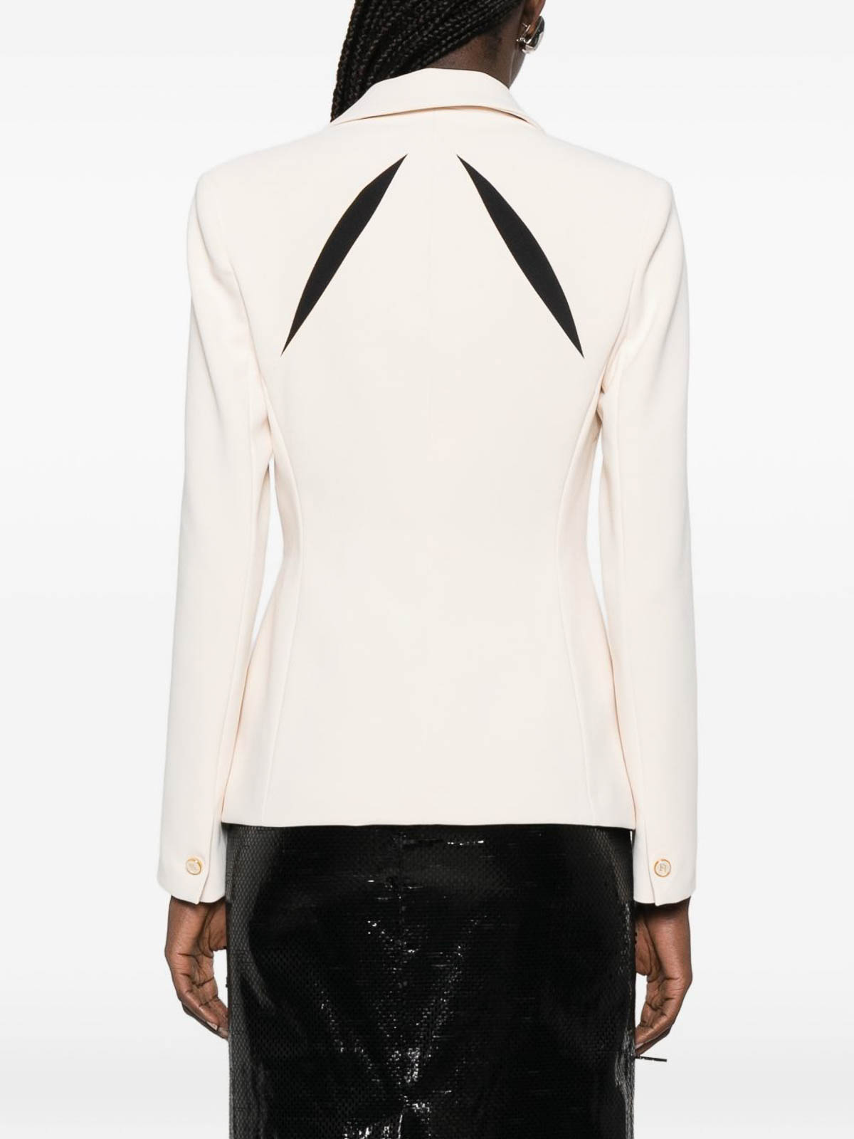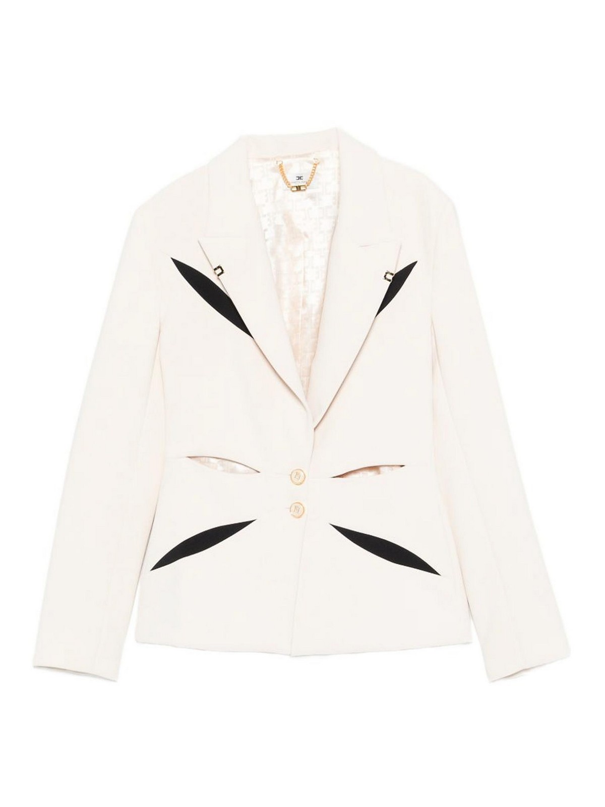 elisabetta Franchiの軽量クレープジャケットは、洗練されたツートンカラーのカットアウトが前面と背面に幾何学的な花柄の象眼細工が施されているのが特徴です。しっかりとした肩とスリムフィットがシルエットを引き立て、モノグラムサテンの裏地が豪華な仕上がりになっています。ボタン留めとゴールドトーンのメタルロゴのディテールでデザインされたこのジャケットは、モダンなエレガンスと洗練された職人技を兼ね備えています。洗練されたスタイリングに最適なこのジャケットは、コンテンポラリーなワードローブにぴったりのステートメントピース。