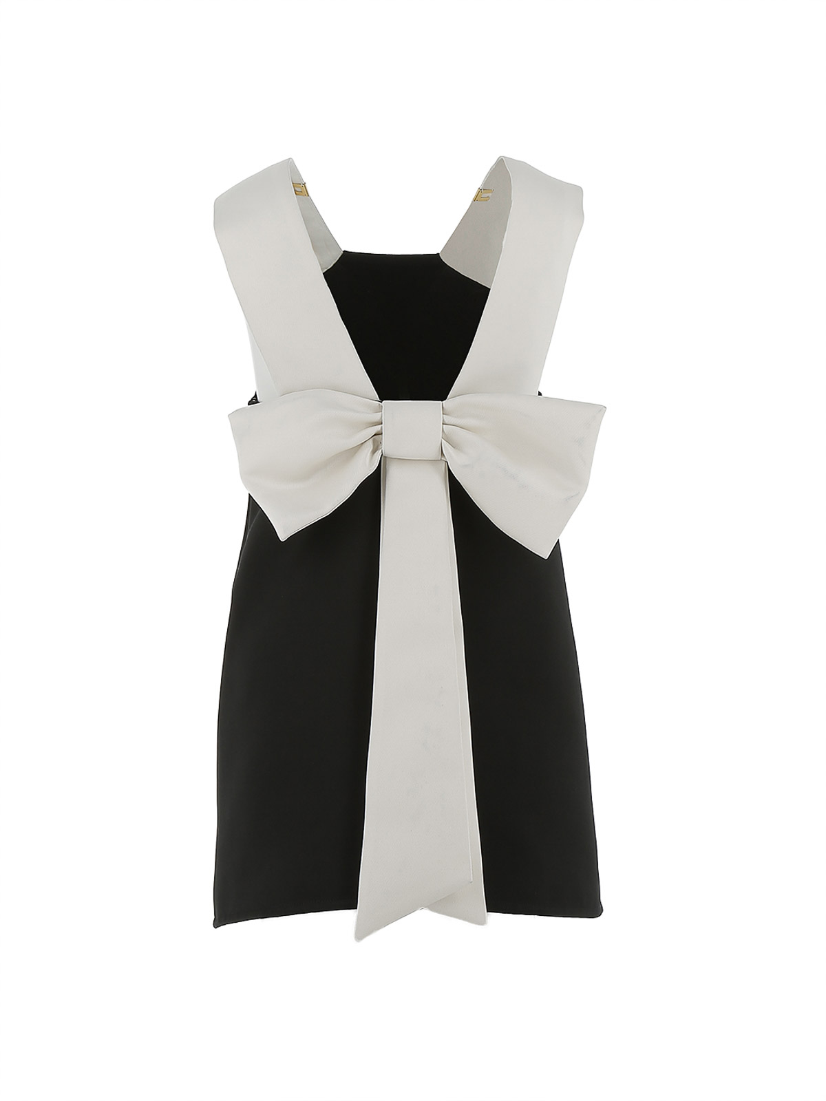 背中にリボンが付き、ストラップにロゴが入った黒と白のドレス