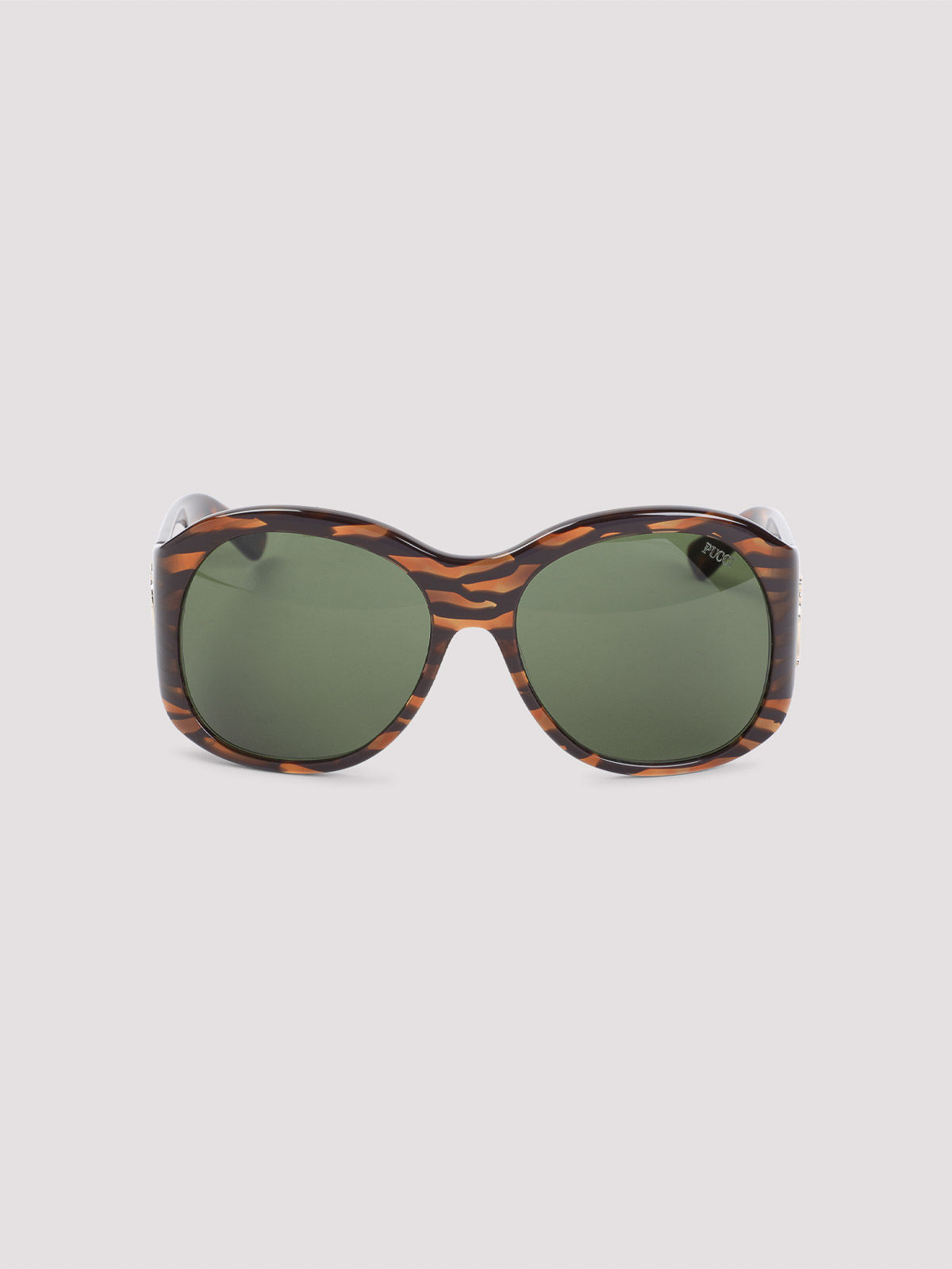 Pucci アイウェアブラウンアセテートサングラス。ブラウンのアセテート製、ラウンドシェイプ、グリーンのレンズ、サイドにシルバートーンのロゴとモノグラム、大胆なテンプル