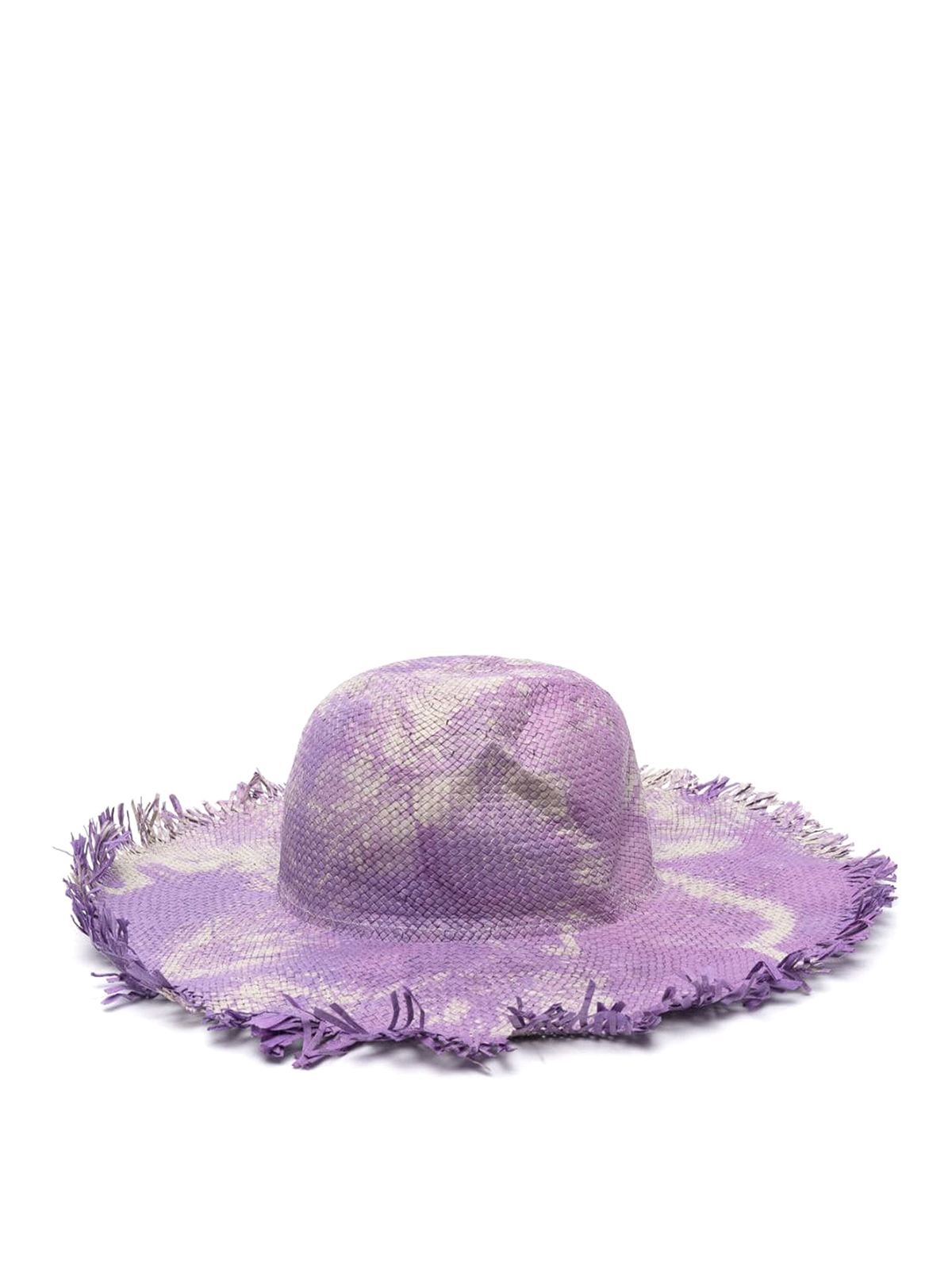 emporio armaniの絞り染めフリンジハット。パープルライラックの絞り染め模様の織りデザイン。プッシュダウンクラウン、フラットブリム、フリンジ付き。