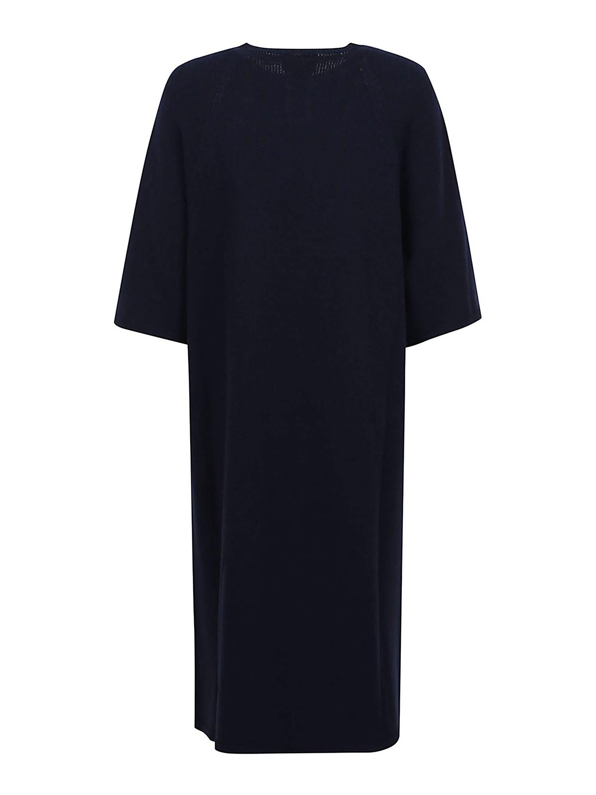 ネイビーブルー、ラウンドネック、ショートスリーブ、ストレートヘム、ミディ丈。