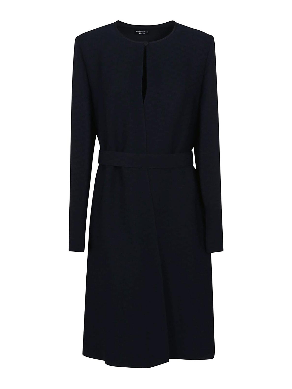 ネイビーブルー、キーホールネックライン、ベルト付きウエスト、ロングスリーブ、Aラインスカート。