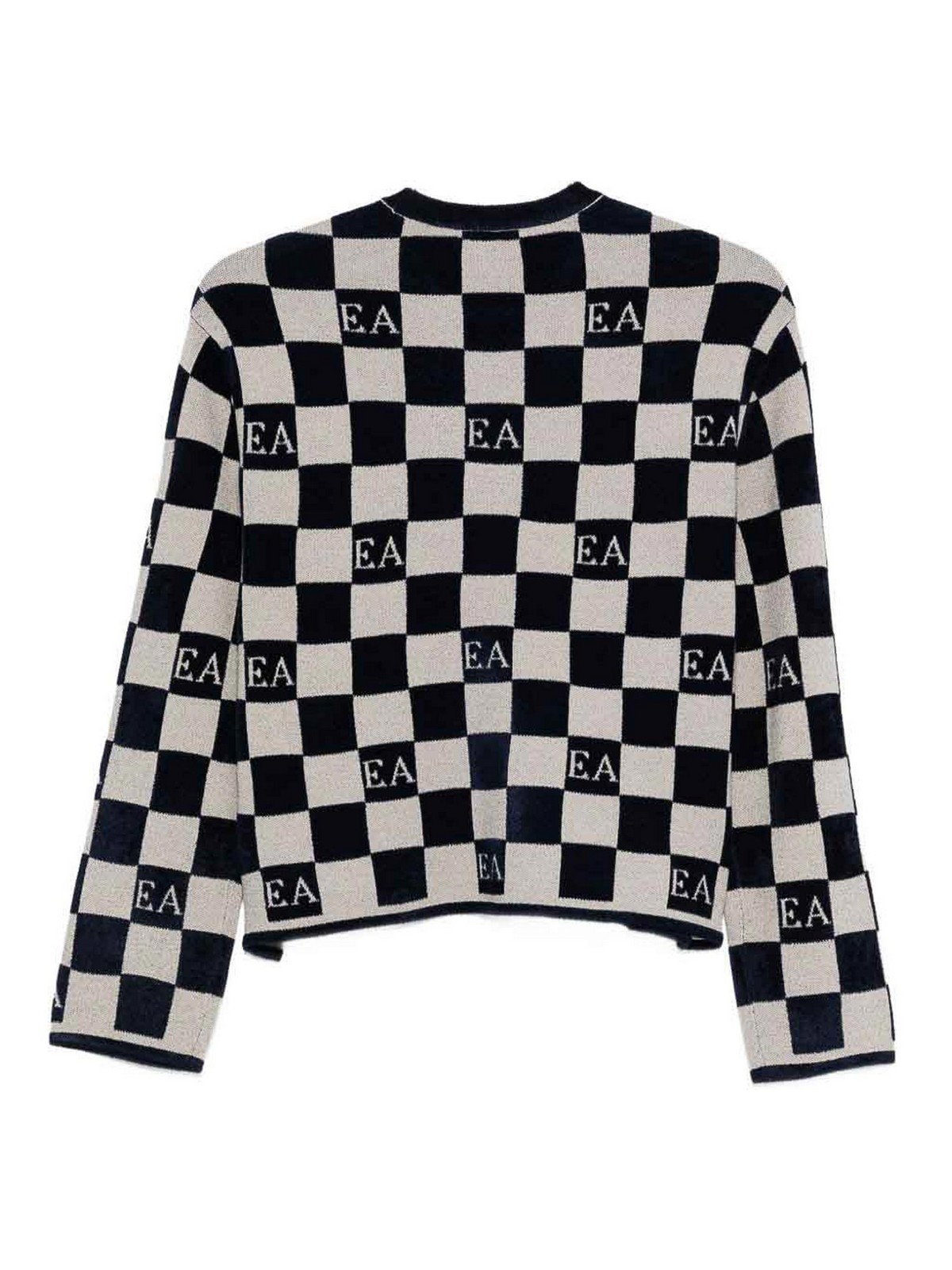 黒とベージュのチェック柄長袖クルーネック、耳のロゴ