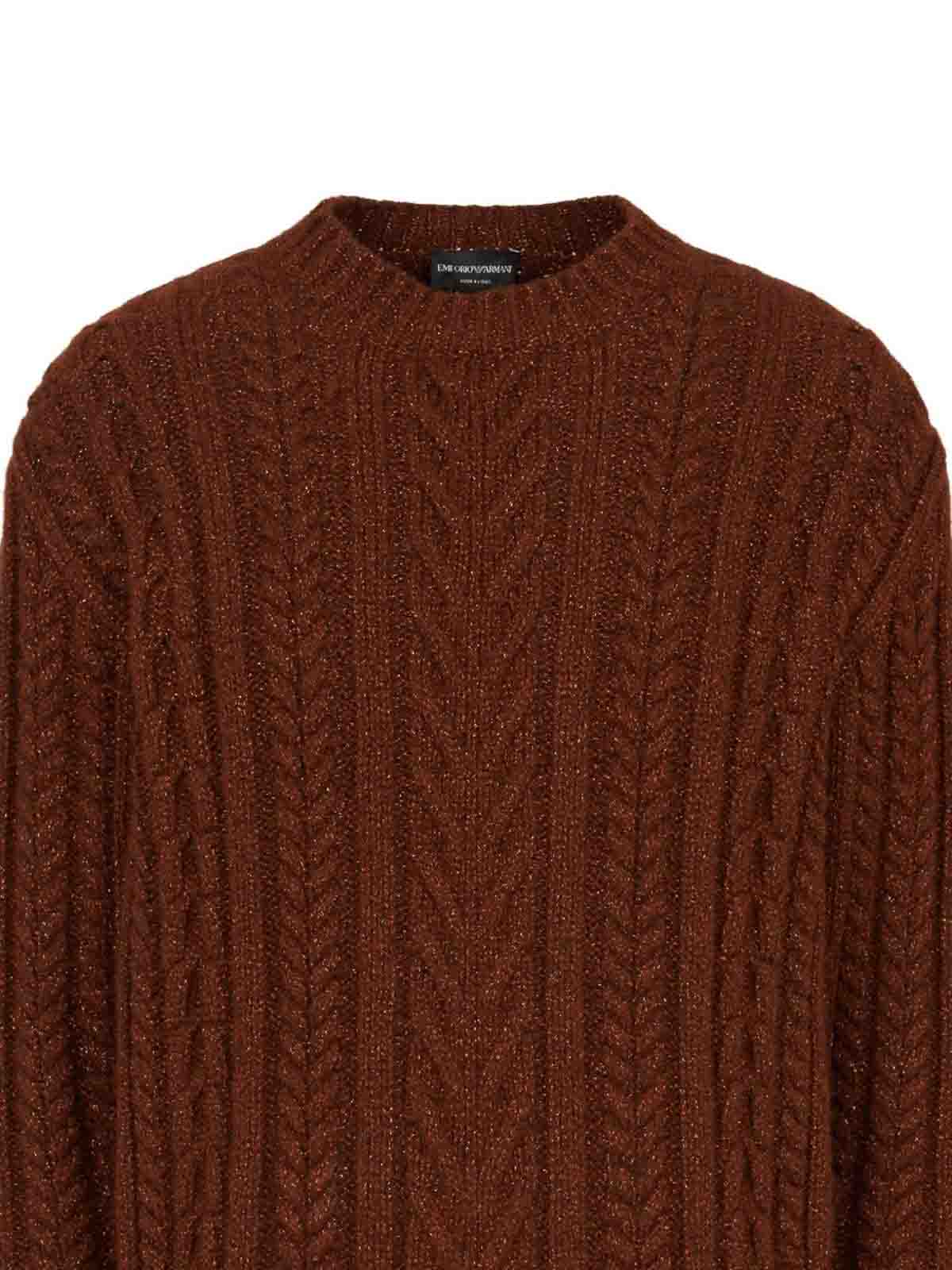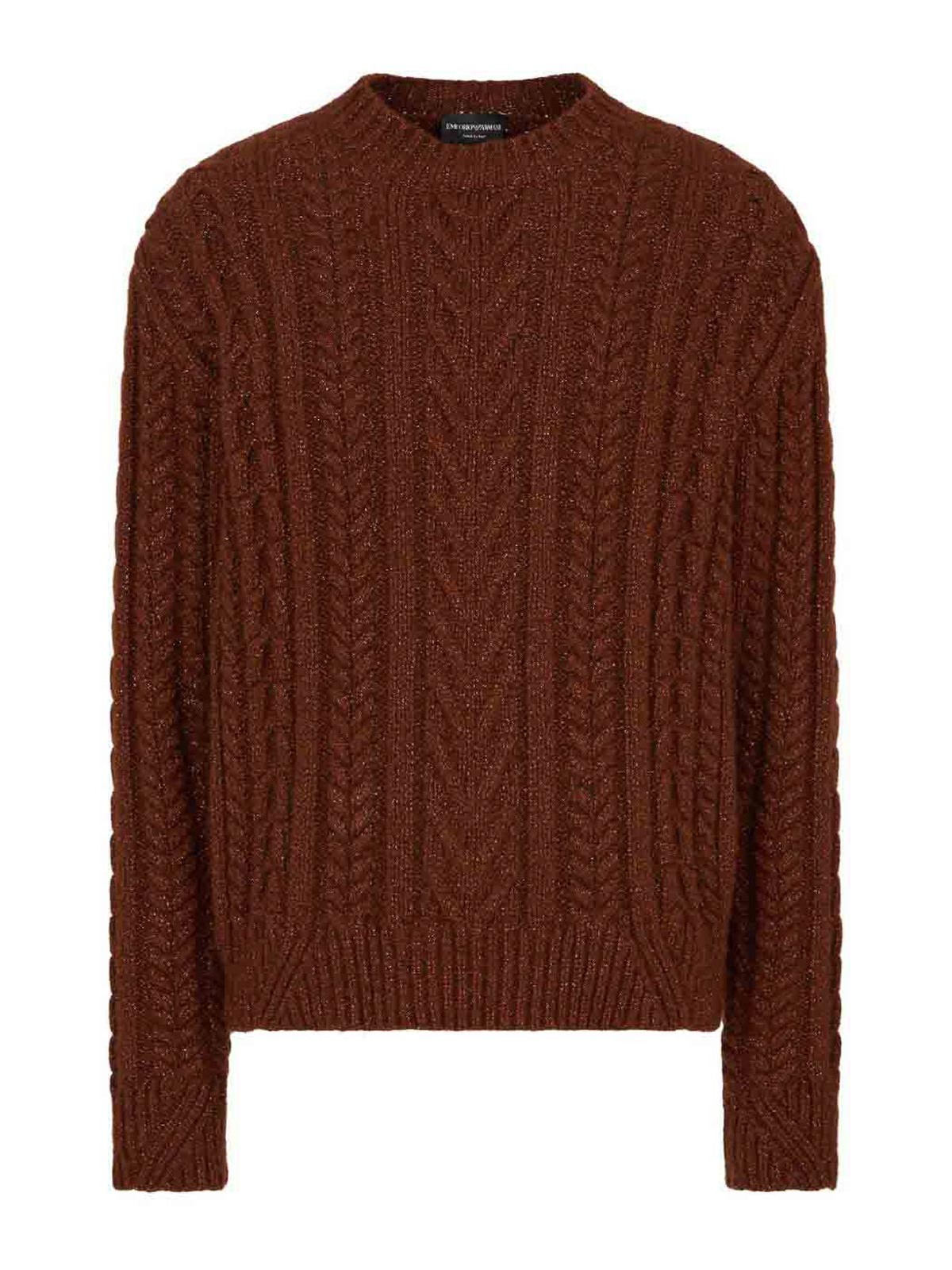 ブラウンケーブルニットラウンドネック長袖リブ編みカフス