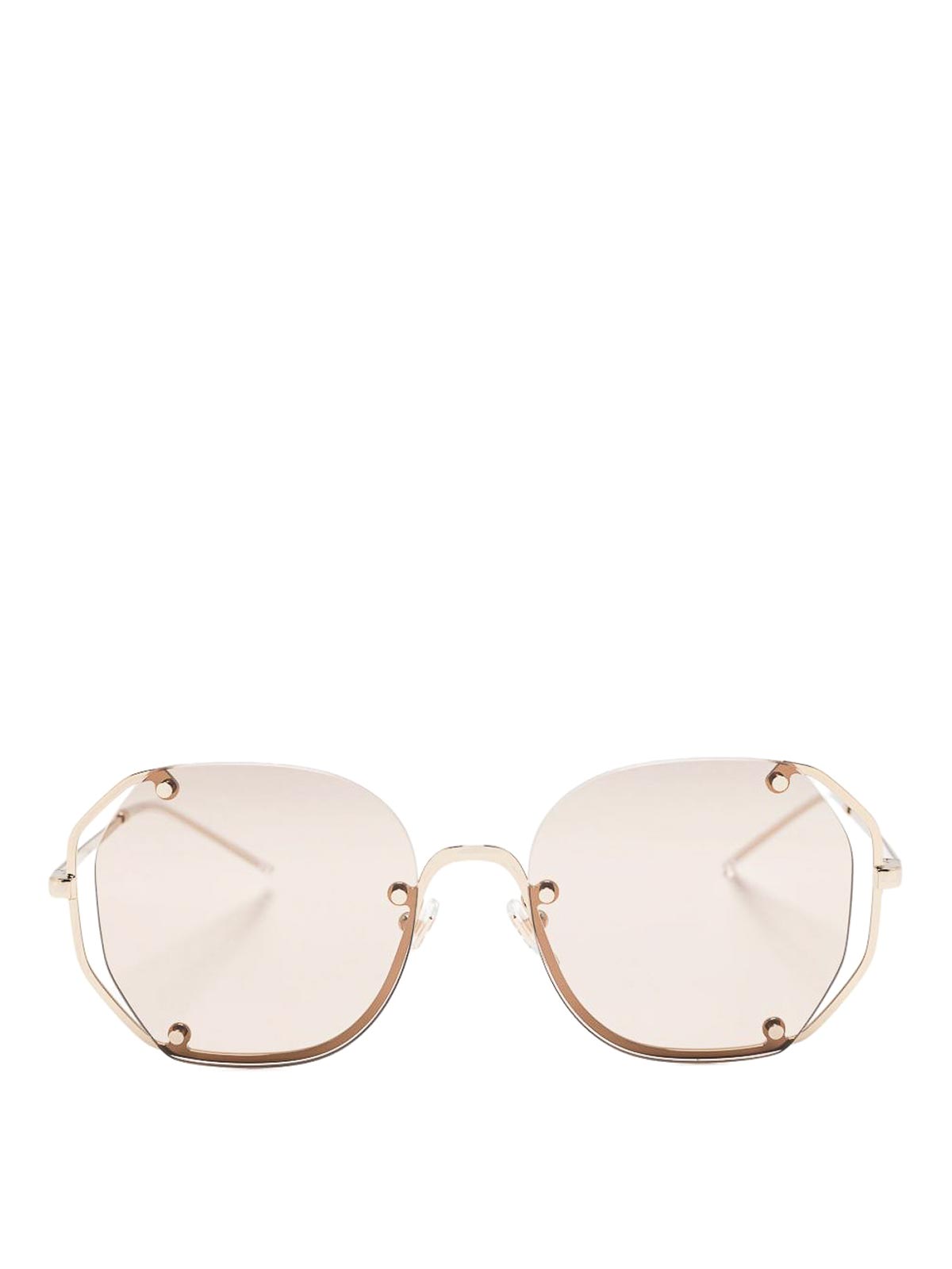 淡い幾何学模様のフレーム、茶色がかったレンズ、スリムアーム、これらのメガネには保護ケースが付いています