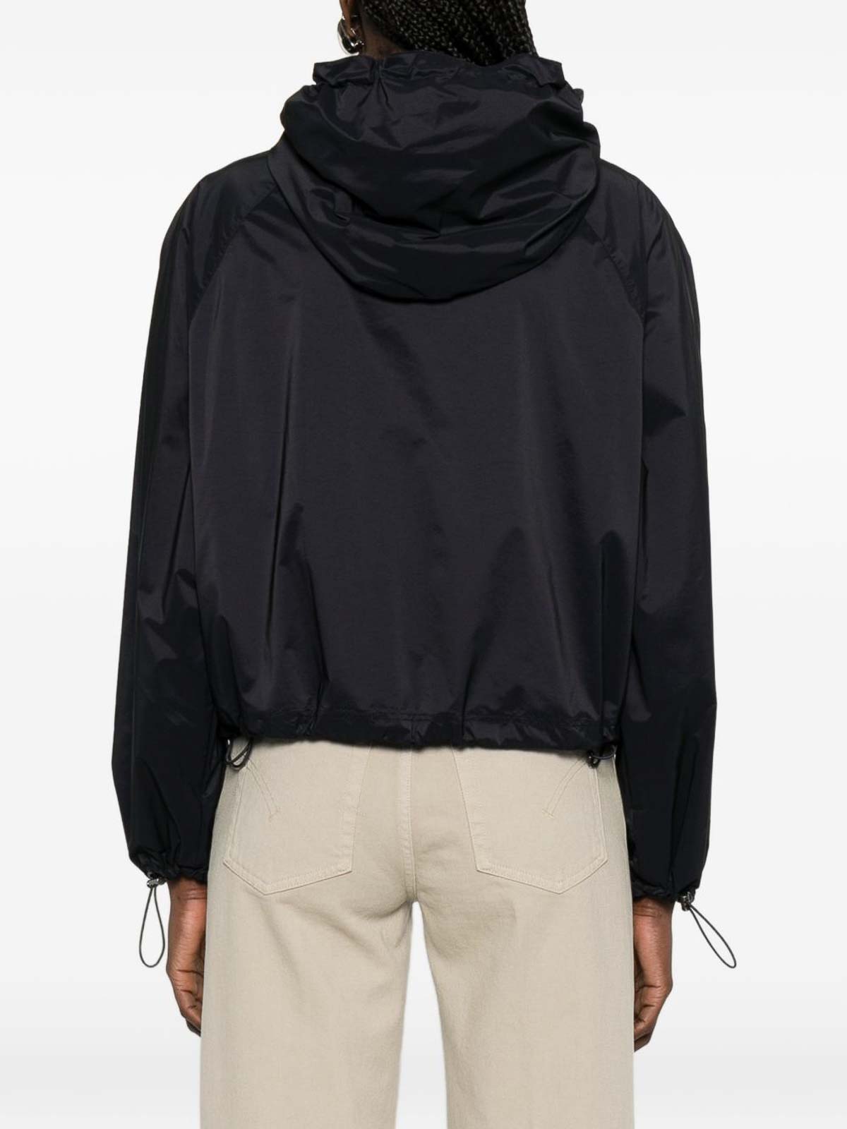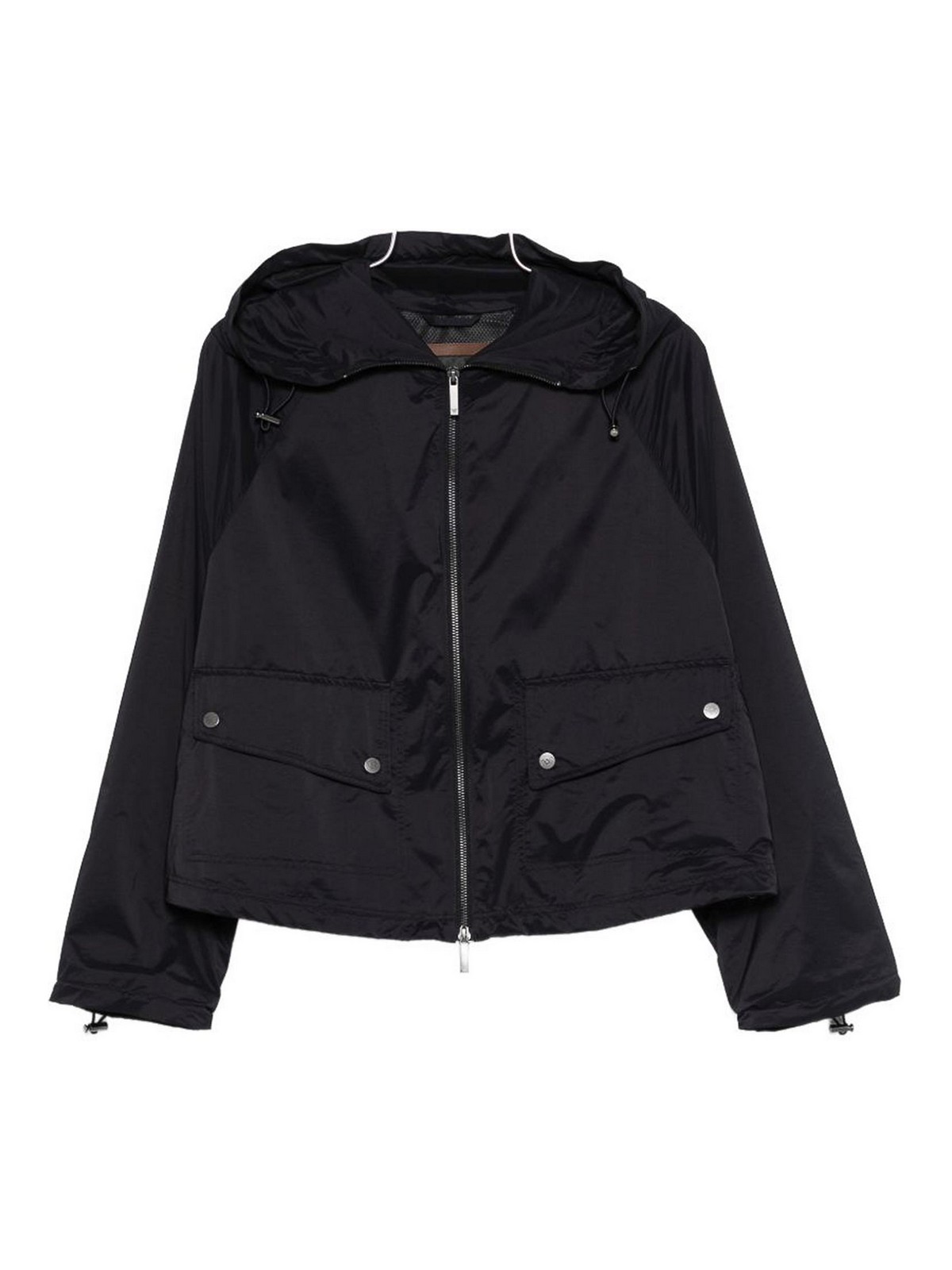 ジッパーとナイロンフード付きのショートブルージャケット。