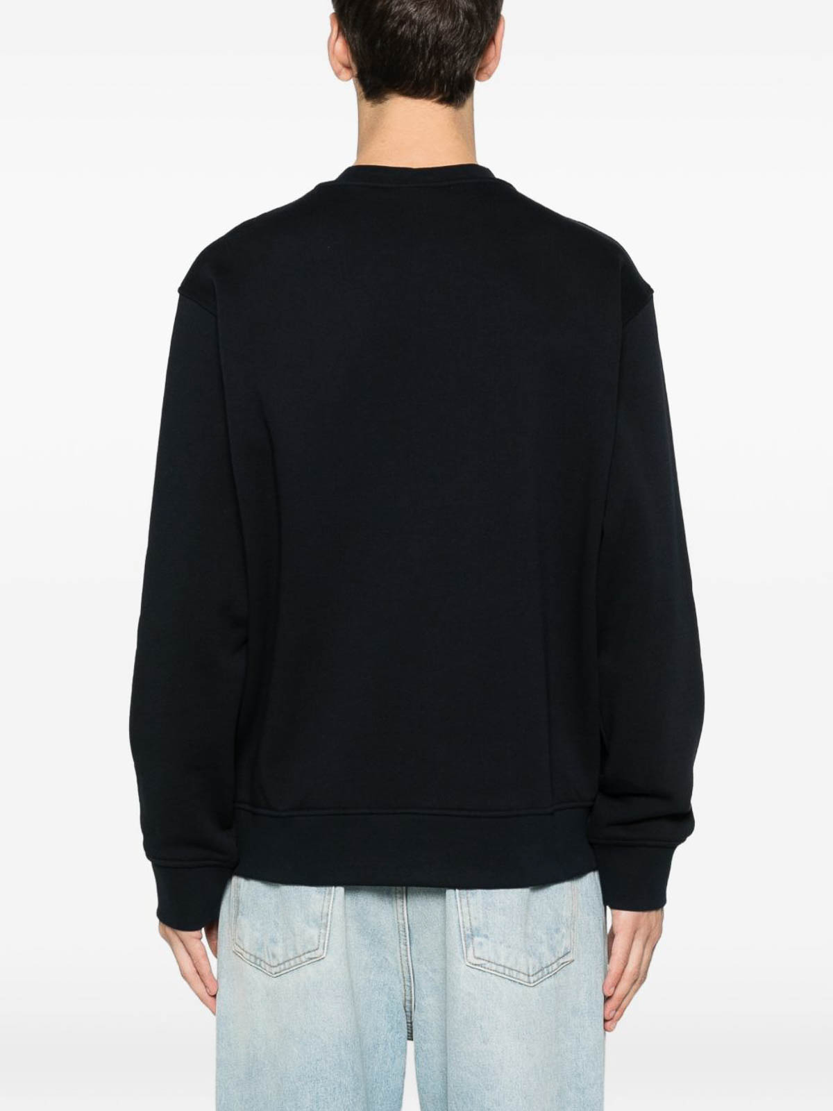ネイビーブルーのロゴレタリングクルーネック長袖リブ編みの裾