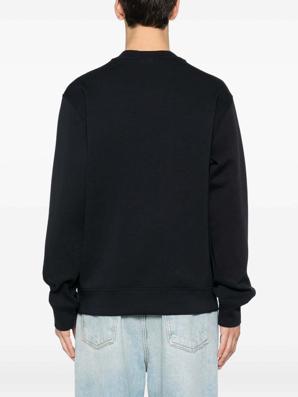ネイビーブルーのロゴディテールクルーネック長袖リブ編みの裾リブ編みのカフス