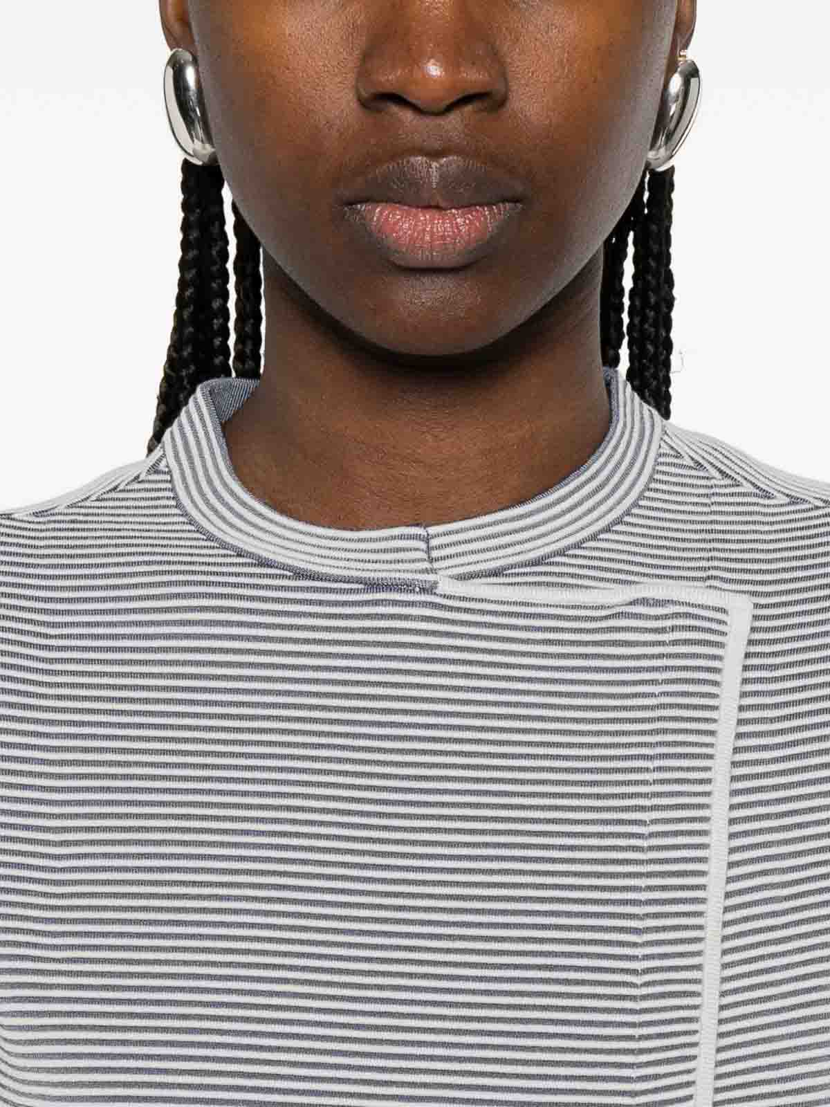 ブルーとグレーのストライプオーバーラップパネルラウンドネックロングスリーブ