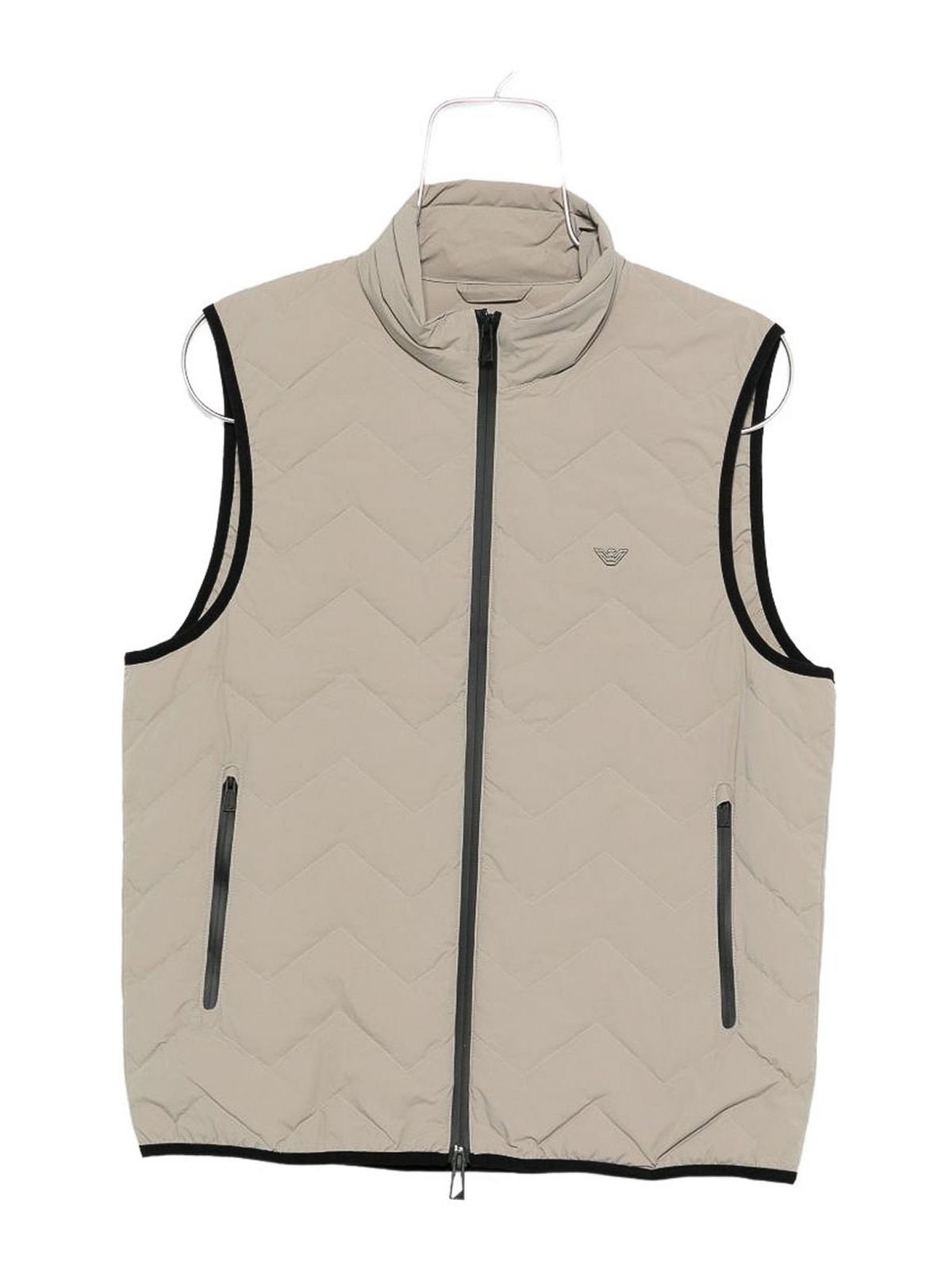 ジッパーとハイネックポケットが付いたダブグレーのナイロンジレ。