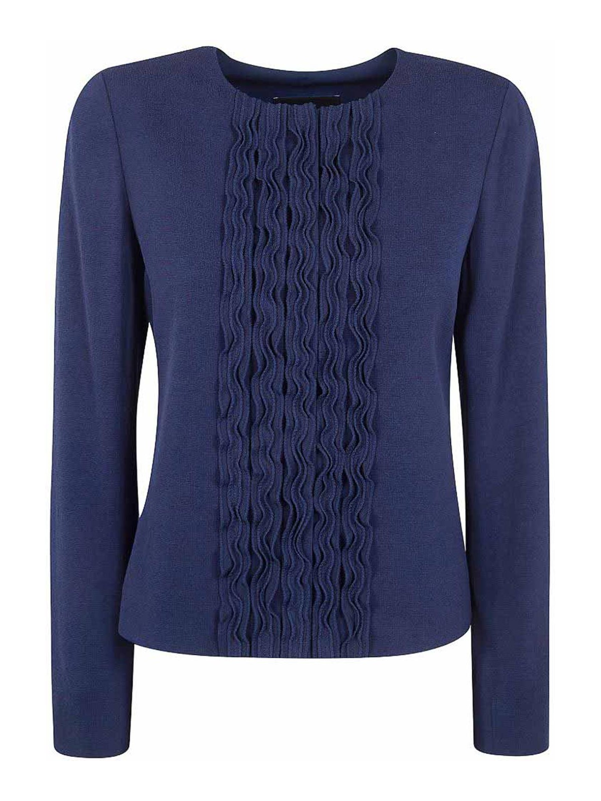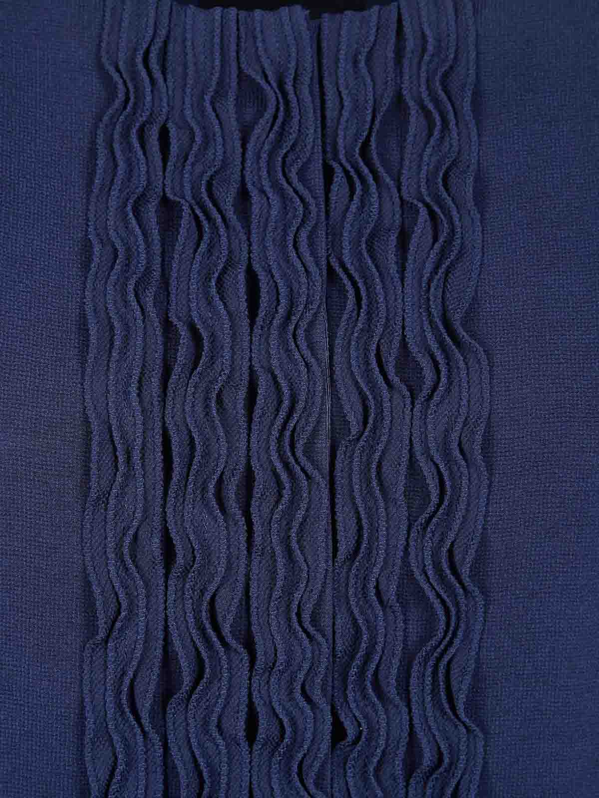 ブルーフリルディテールロングスリーブラウンドネックフィットシルエットコンシールドファスニング