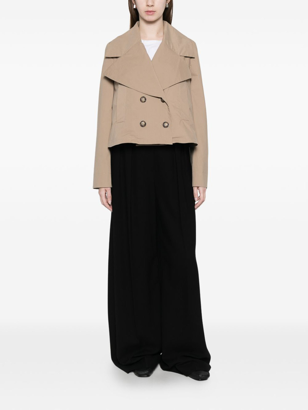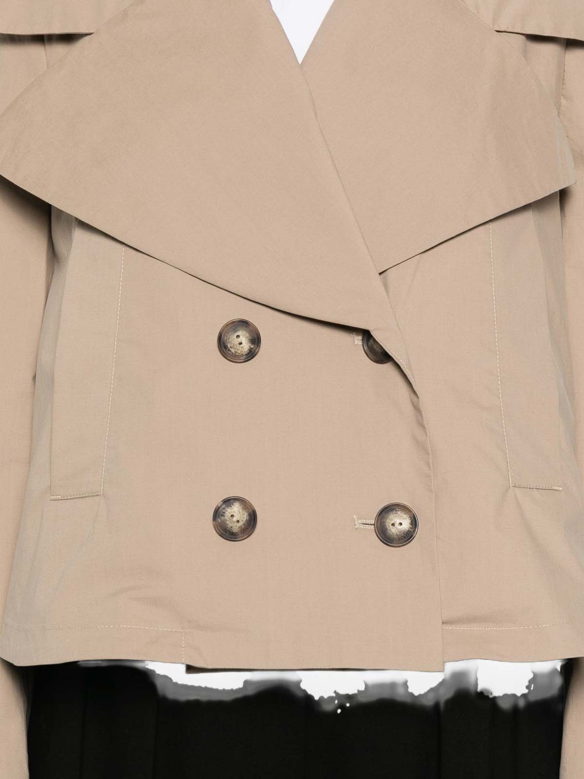 ベージュのダブルブレストボタン留めワイドスリーブフラップディテール