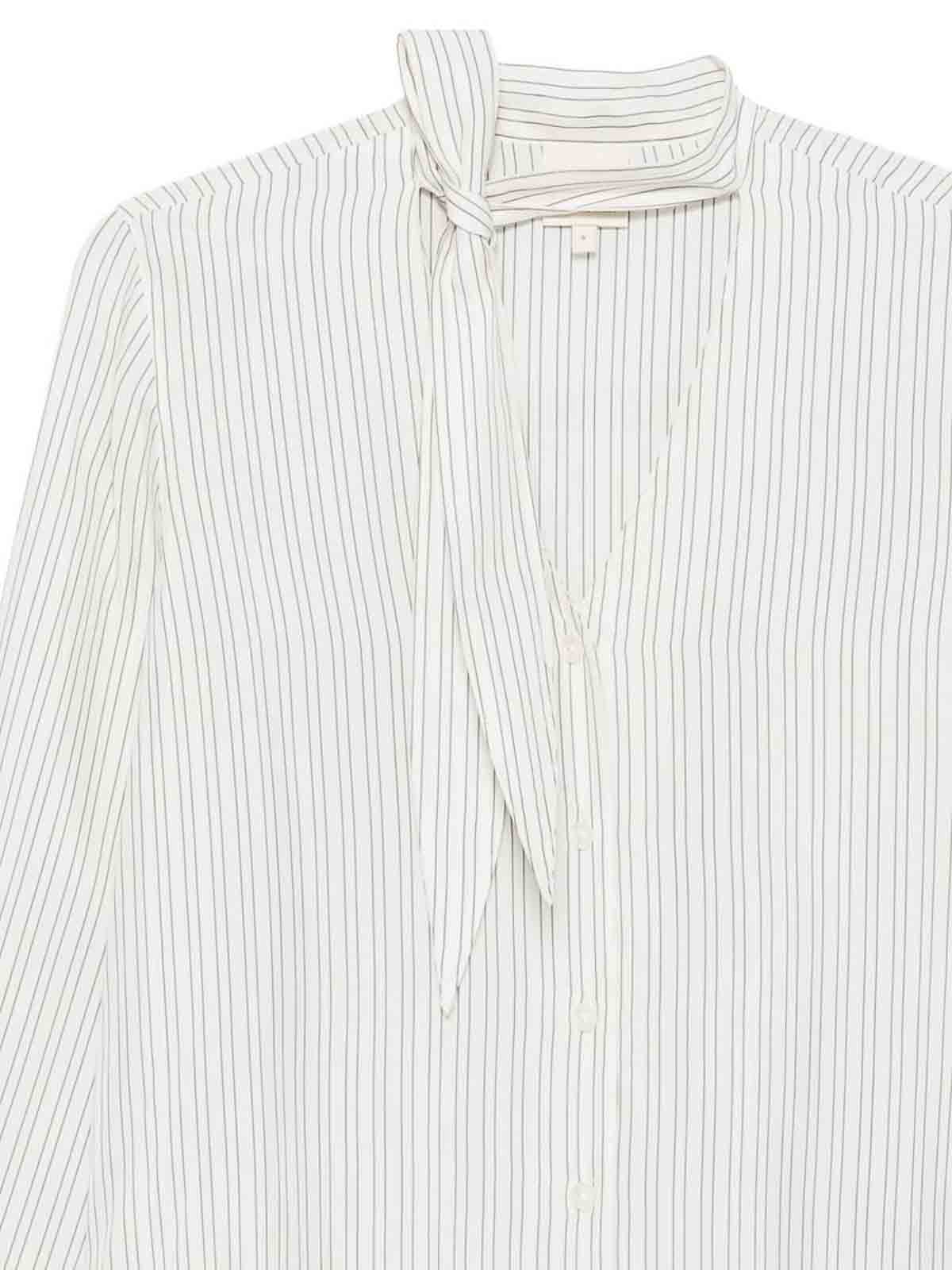 オフホワイトのストライプのセルフタイネックボタン留め