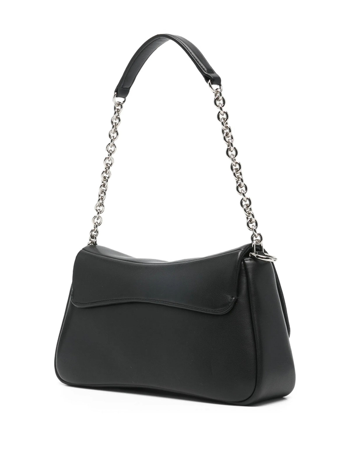 ブラックシルバートーンの金具チェーンリンクショルダーストラップ、トップハンドルロゴプレートフラップトップ。このピースには保護用のダストバッグが付いています。