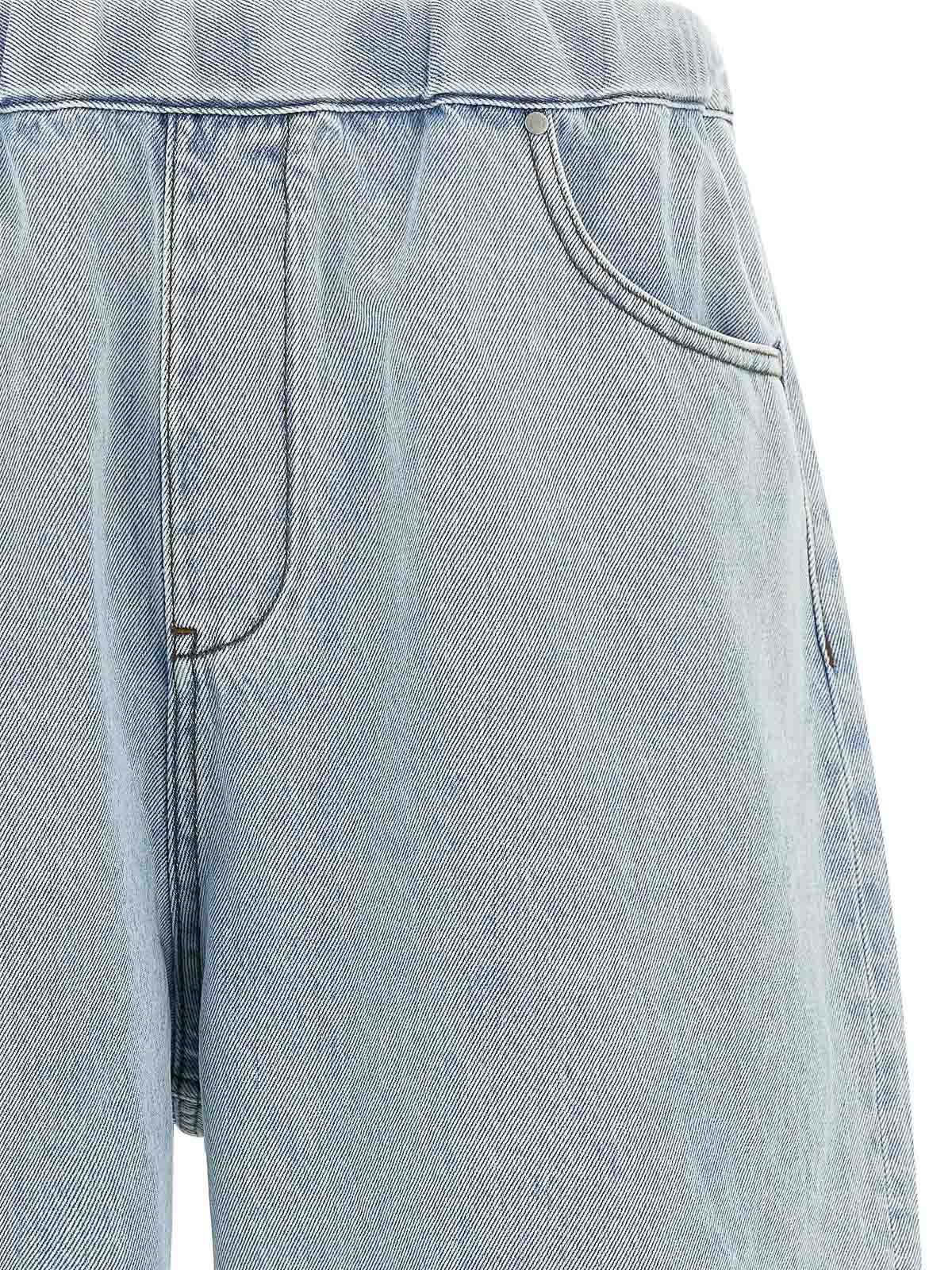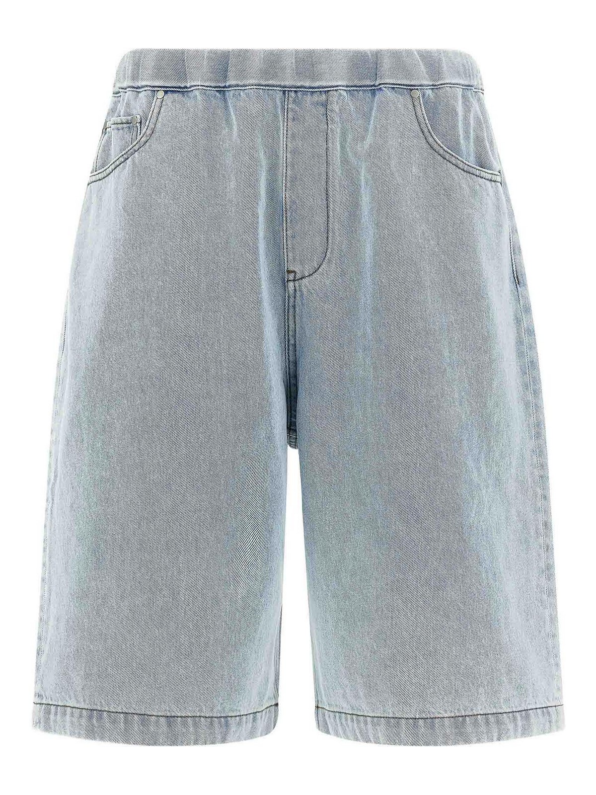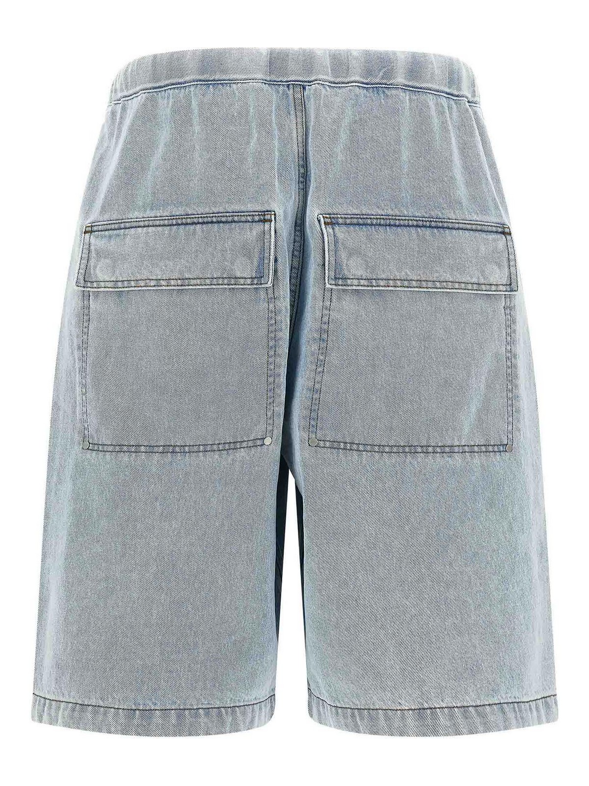 コントラストステッチのスパーコットンデニムバミューダショーツ、ドローストリングの伸縮性ウエストバンド、Trompe l'Oeilフラップ、ワイドレッグ、ファイブポケット。