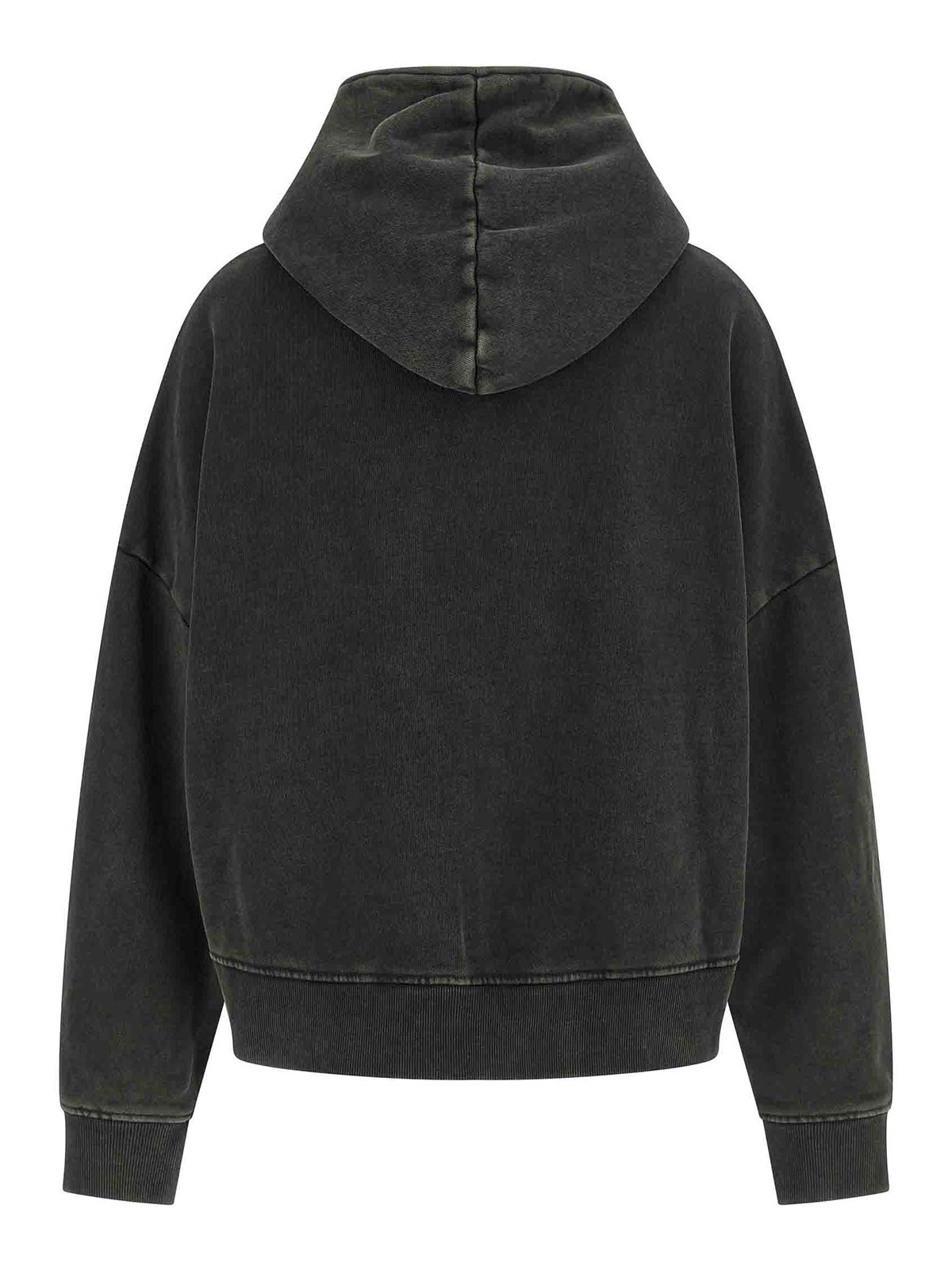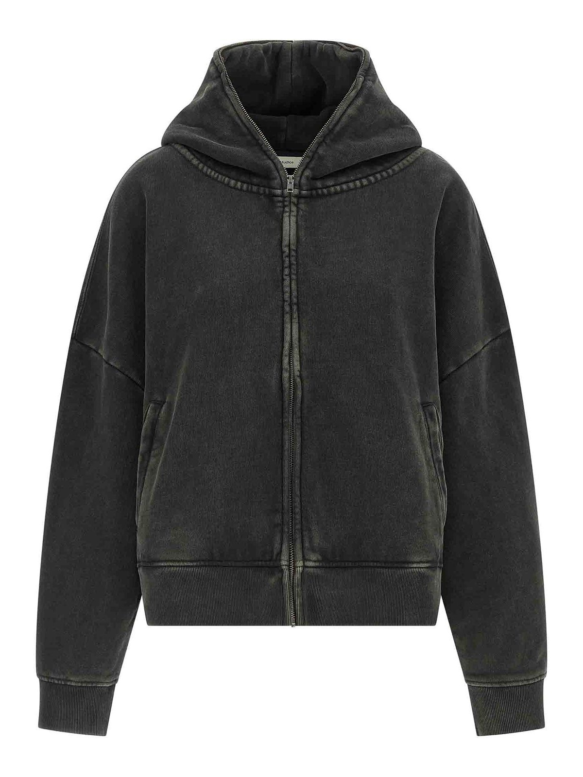 エターナルのパーカーは、衣類染めと酵素ウォッシュ加工を施した510gsmのフリースコットン、フロントファスナー、ポケット、袖口とドロップショルダー付きの長袖、裾にバンド。