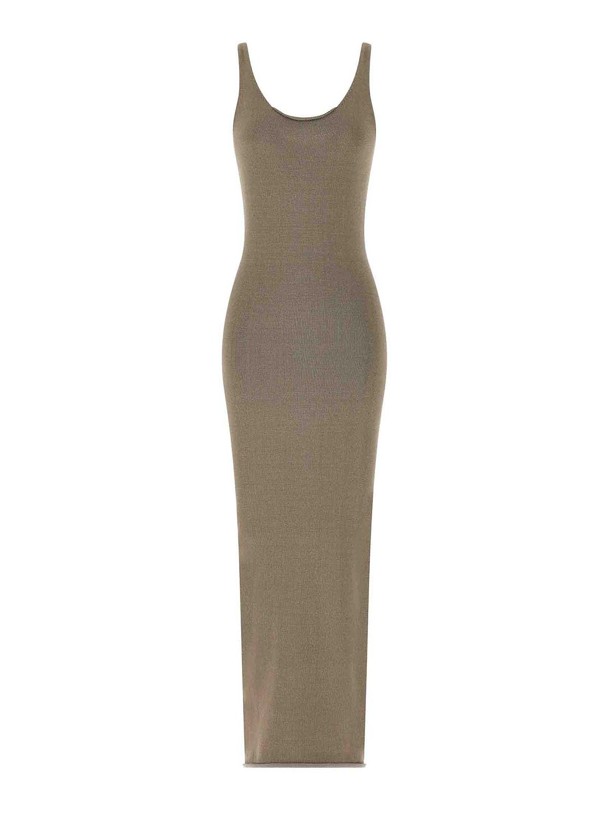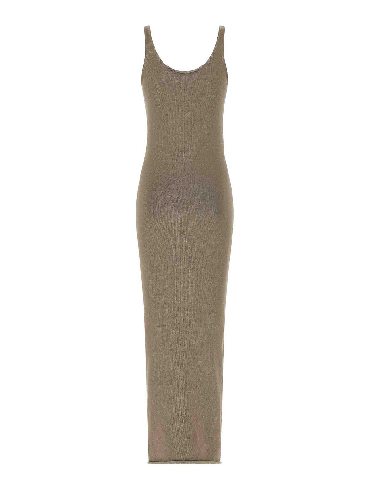 生編みのミディドレス、前後にラウンドネックラインが入ったチューブスタイル、ノースリーブ、未完成のトリミング。