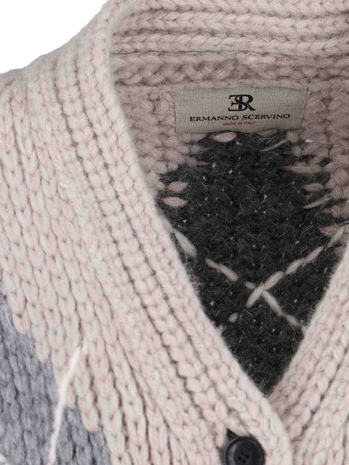 Ermanno Scervinoシャツカーディガン、ミックスアルパカベージュ、ひし形のモチーフ、ボタン留め、フラットポケット2つ、コースト仕上げ、ストレートヘム。
